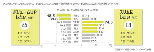 ファッションを楽しむための理想の体型を部位別に尋ねたところ、ボリュームをつけたい部位の1位は「胸もと」48.5%、2位は「ヒップ」39.8%でした。反対に、スリムにしたい部位の1位は「ウエスト」74.5%で、「腹部、膝上、二の腕」も過半数を超えました。