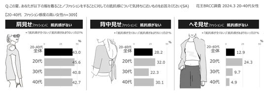 現在流行中の肩や背中が開いた肌の露出が多いファッションについて、各年代に着用への抵抗感の有無を尋ねました。その結果、「肩見せファッション」は20-40代いずれの世代も4割以上、「背中見せファッション」は全体の約3割が抵抗感がないと回答。また、「へそ見せ」ファッションに関しては、20代の4人に1人は抵抗感がないことがわかりました。