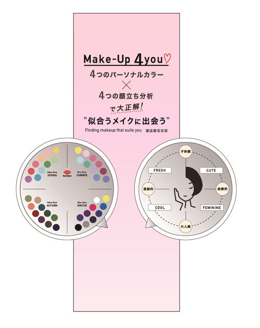 原宿駅前にある資生堂の原宿本店「資生堂ビューティ・スクエア(Beauty Square)」は、似合うメイクに出会う特別企画「Make-Up 4 you(ハート)」を6月1日(土)から実施いたします。資生堂の4つのパーソナルカラー分析と4つの顔立ち分析を掛け合わせ、あなたに似合うメイクをご提案。資生堂ビューティ・スクエアならではのパーソナライズされたメイク提案を行っていきます。花火大会や夏祭り、フェスなど大きなイベントを控える夏に、自分に似合うカラーラインナップのご提案だけではなく、各アイテムの塗布部分のアドバイスをお客さまの顔立ちに合わせてご紹介し、魅力を引き出す体験をサポートします。