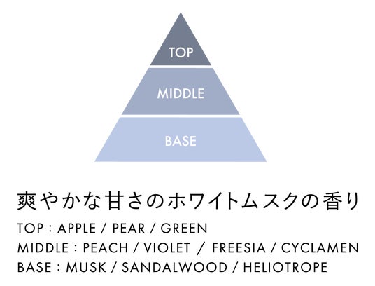 ホワイトムスクの奥深く透明感あふれる印象はしっかりと残しながら、アップルとペアが奏でる優しいフルーティーノートから始まり、ほのかに香るグリーンがエッセンスに。