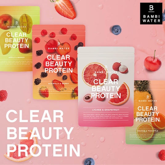 トータルボディメイクブランド「BAMBI WATER(バンビウォーター)」を展開する株式会社ラングレー(本社:東京都渋谷区、代表取締役:栗原 淳徳)は、シェイカー不要で手軽にプロテインを摂取できる『BAMBI WATER クリアビューティープロテイン』を2024年6月4日(火)より各ECモールにて販売開始します。4種類のフルーティーなフレーバーで美味しく美容をサポートします。