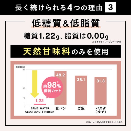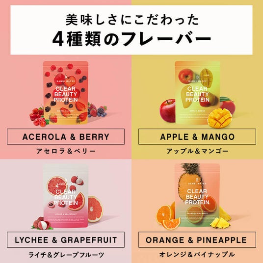 『BAMBI WATER クリアビューティープロテイン』は、プロテインの摂取をより手軽に、美味しく楽しんでいただけるよう開発したジュースのような飲み口のプロテインです。シェイカーを使わず水に簡単に溶けるため、どこでも手軽にタンパク質を摂取できます。美容目的で気軽にプロテインを摂取したい方、甘いプロテインが得意ではない方、スッキリとしたプロテインを求める方、乳糖不耐症や乳・大豆アレルギーでプロテインドリンクの摂取を諦めてしまった方に特におすすめです。