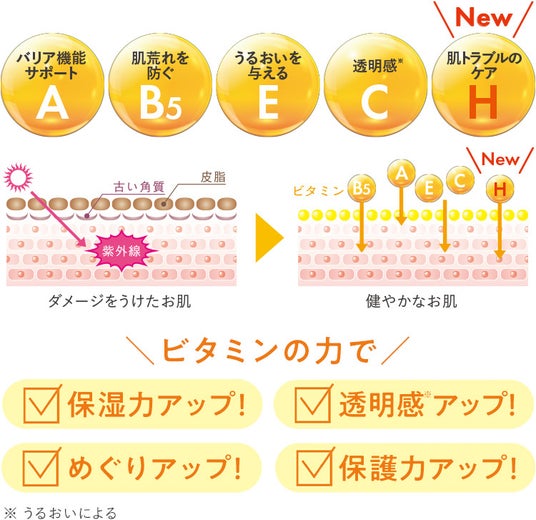 さらに、肌荒れを防ぎ肌トラブルをケアするビタミンHを新配合し、7種類のビタミン※2でエネルギーチャージ。肌にうるおいを与えながら、優しくピーリングできます。