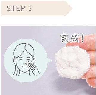 出来上がったコットンを頬やTゾーン等、毛穴の気になる部分に5~10秒程やさしく押しあててください。目元は、一番最後にお使いください。その後、乳液・クリーム等でお肌を整えます。