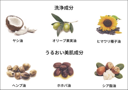 1本で顔も身体も洗え、毛穴汚れやメイクも落とせるのにつっぱらず、やさしい使用感。絶妙なバランスで処方された洗浄成分(オリーブ果実油、ヤシ油、ヒマワリ種子油)と、うるおい美肌成分(ヘンプ油、ホホバ油、シア脂油)がしっとりスベスベ美肌に洗い上げます。