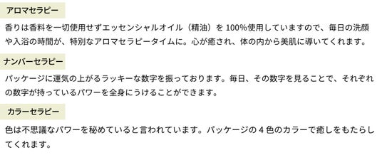 ピュア カスチールソープ プラスは洗うことと同時に、香り、数字、カラーにより3つのセラピーができます。