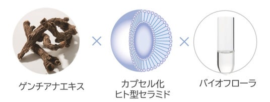 「ゲンチアナエキス」、「カプセル化ヒト型セラミド」、「バイオフローラ」が肌のうるおいとバリア機能をサポートします。