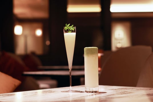 ハトムギ茶とヨーグルトでつくった自家製シロップ入りのフローズンカクテル。抹茶とヨーグルトの泡を乗せ「スキコン」のボトルをイメージしました。甘みの後に、ハトムギの香りがふわりと抜けていく優しい味わいをお楽しみください。