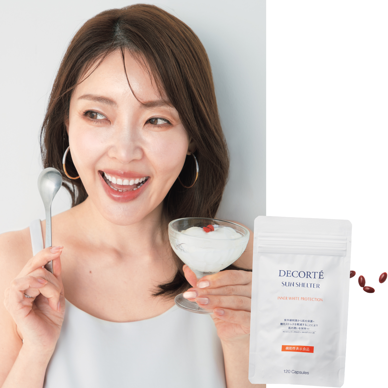 「シミは内側からのケアも大事。サプリは血中に入って作用するので厳選して継続します。揚げ物や刺激物は特別な時だけで我慢」今年取り入れている新作。UVケア成分に美肌ケア成分もプラス。紫外線対策と保湿ケアを同時に。サンシェルター インナー ホワイトプロテクション 120粒 ¥6,480(コスメデコルテ)