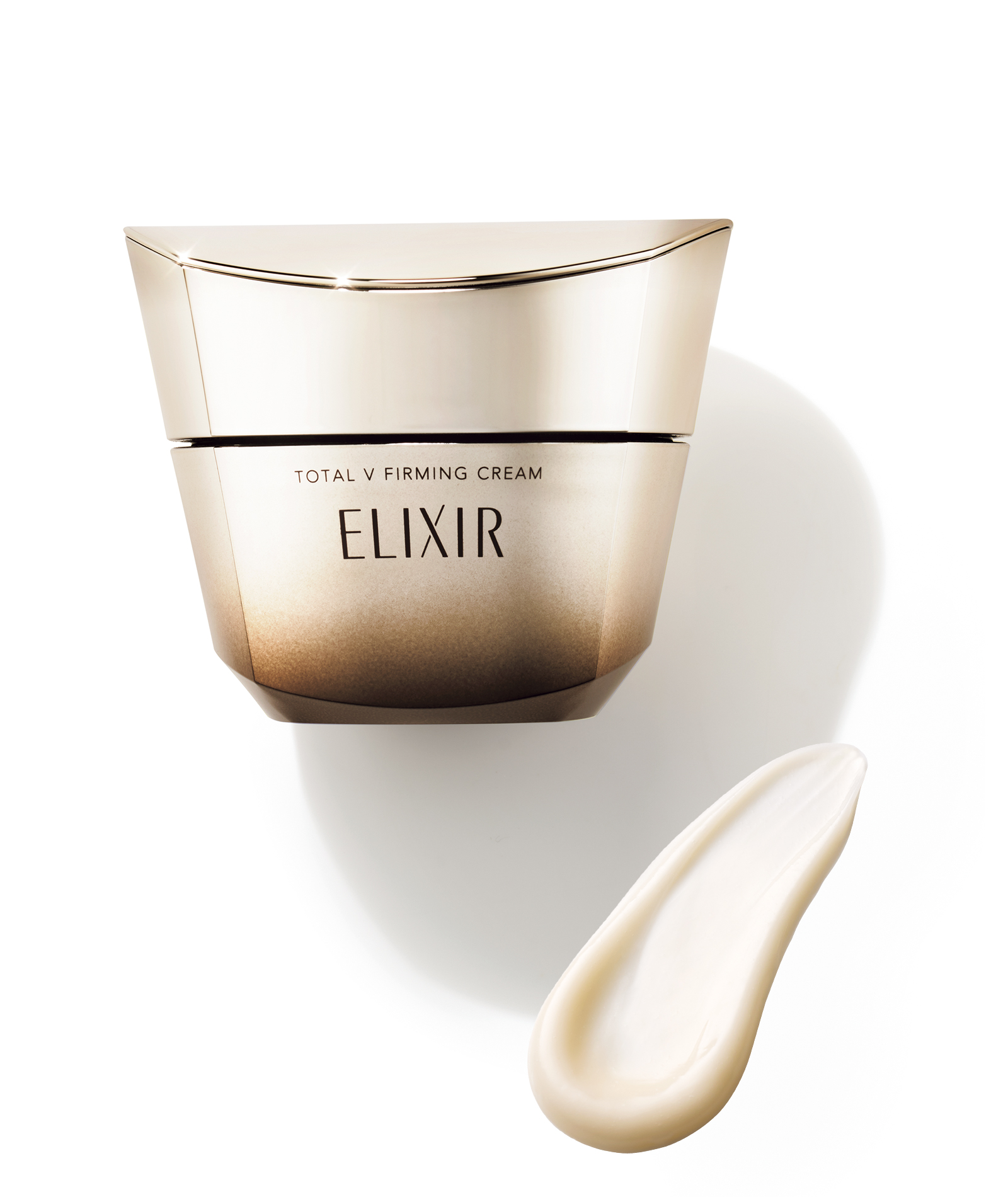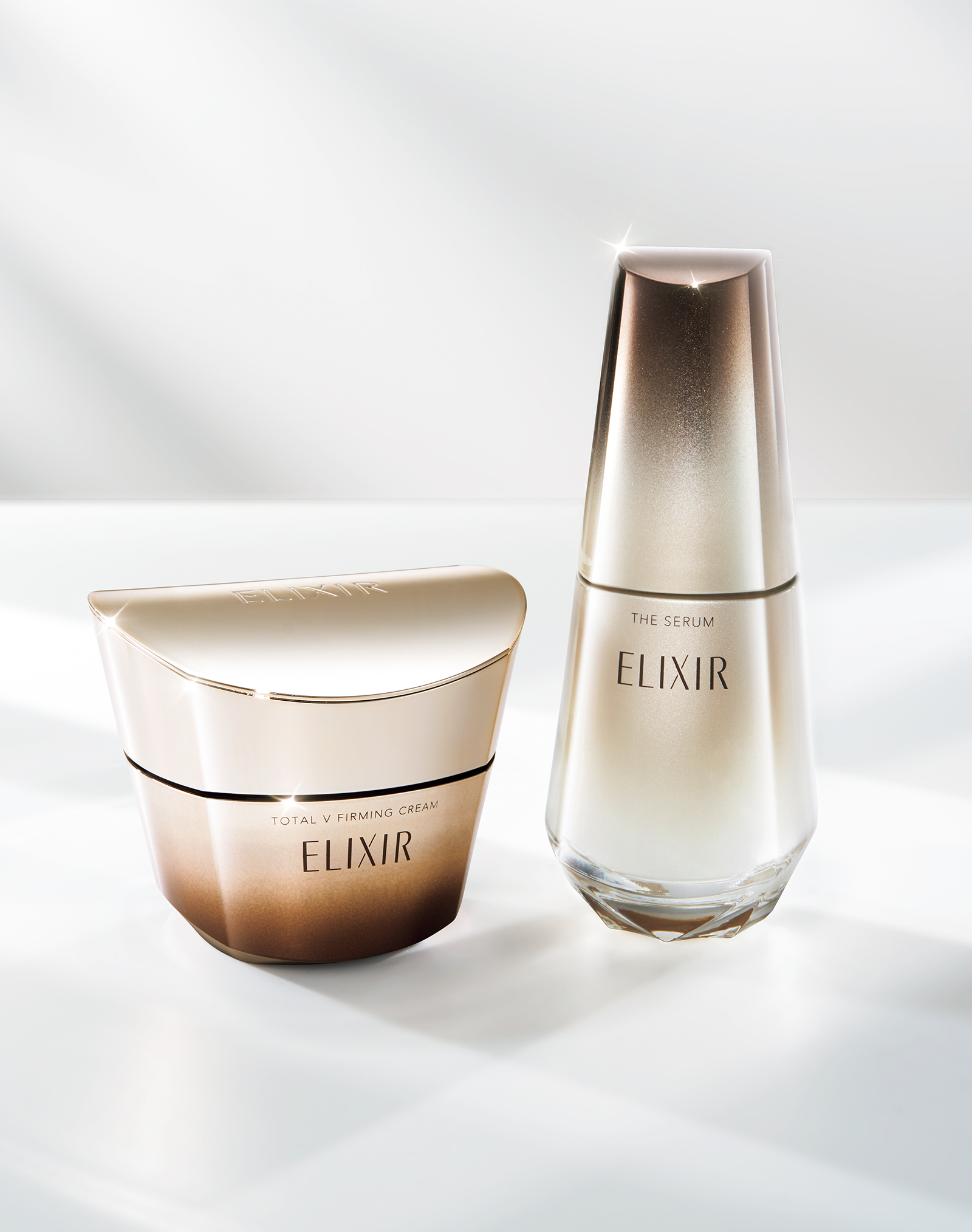 左から:ゆるみ* の原因を全方位ケア。エリクシール トータルV ファーミングクリーム 50g ¥11,000、大人の複雑な肌悩みにマルチ対応。エリクシール ザ セラム aa[医薬部外品]50㎖ ¥8,910(ともにエリクシール)*ゆるみ…ハリのない状態