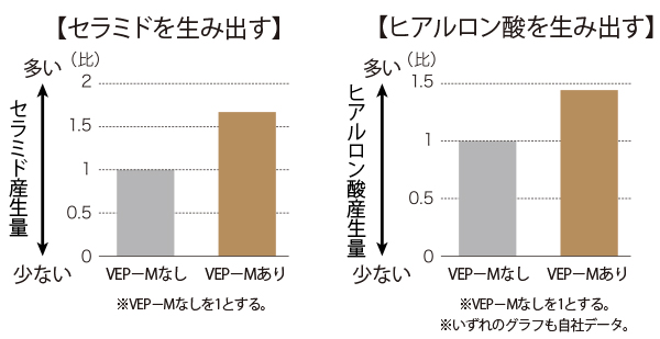 安定化ビタミンE誘導体研究を続け、2021年に辿り着いたオリジナル有効成分「VEPーM」。加齢や紫外線などの影響でセラミドやヒアルロン酸が減少。表皮の柔軟性が低下することで、表情ジワが元に戻らなくなり、シワの原因になります。「VEPーM」は、それらを生み出し、表皮の柔軟性を高めてシワを改善します。