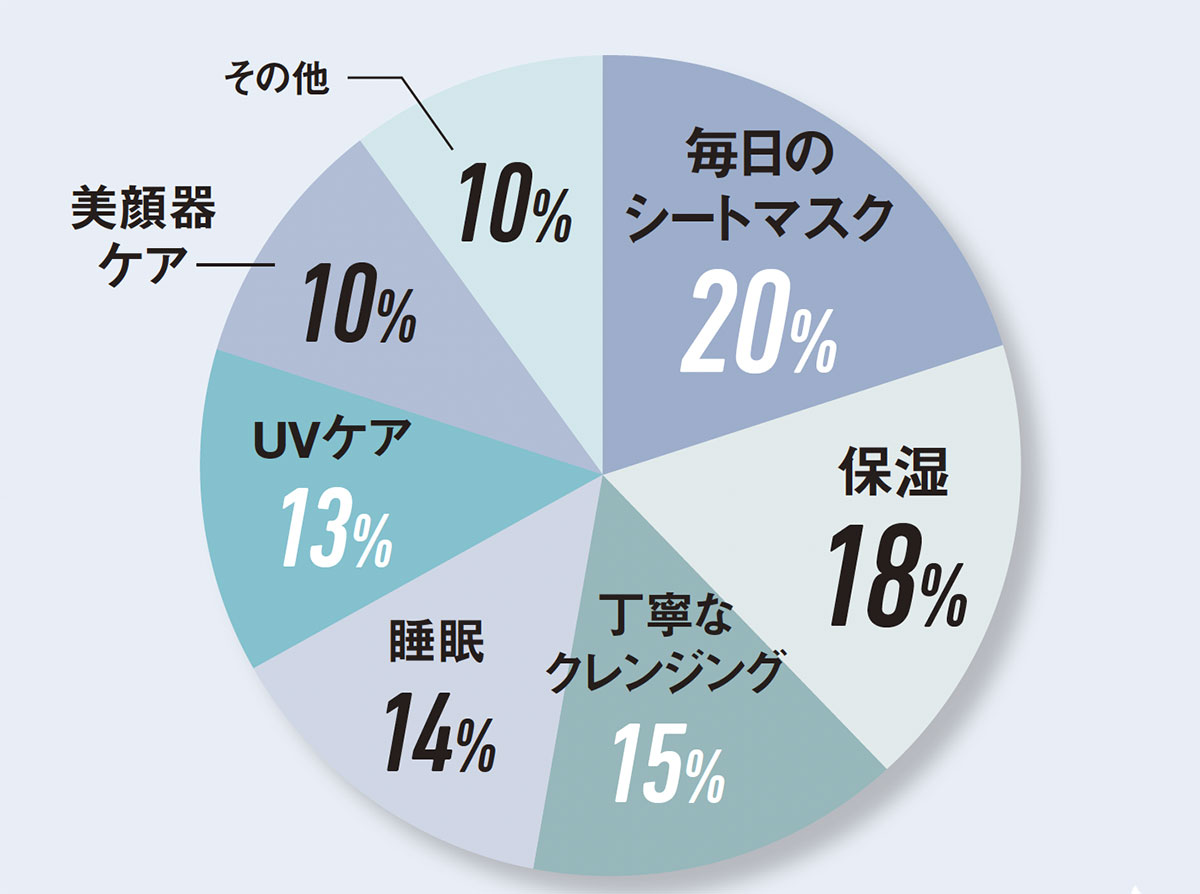 誰でも真似できる美容の“基本のキ”が上位にランクイン。当たり前のことをきちんと丁寧に行う美意識が高い女性の正しい生活が垣間見える結果でした。大人は毎日の積み重ねが大切!