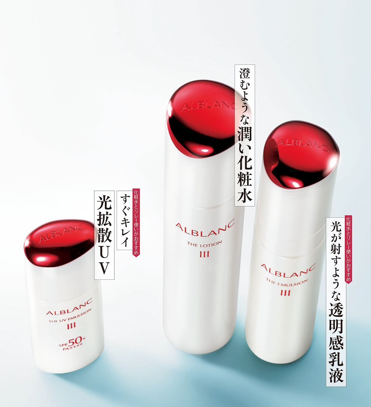 中:アルブラン ザ ローションⅢ【医薬部外品】140㎖ ¥5,500、右:アルブラン ザ エマルジョンⅢ【医薬部外品】80g ¥6,050、左:アルブラン ザ UVエマルジョンⅢ【医薬部外品】 30㎖ SPF50+・PA++++ ¥6,050(すべて編集部調べ)(すべて花王)販売名:アルブラン ローションⅢg、アルブラン エマルジョンⅢg、アルブラン UVエマルジョンⅢg