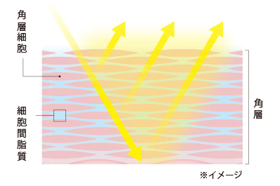 透明感のある肌は角層での光の散乱がポイント。水を抱えた角層細胞と、細胞間脂質によって潤い密度の高い角層は、光の散乱性が高まり、透明感として感じられます。