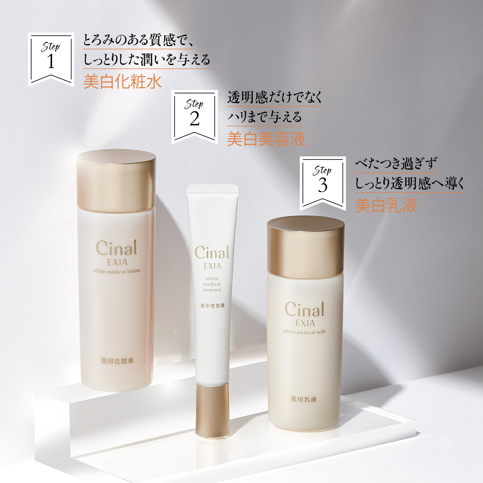 60年以上の歴史のあるビタミンCブランド「シナール」から出たスキンケア。その知見とこだわりが詰まった薬用化粧品「シナールエクシア スキンケアシリーズ」は、全アイテムにW美白※1有効成分を配合して独自のシミ対策※1メソッドを追求! 美容賢者も注目する本格シミ対策です。