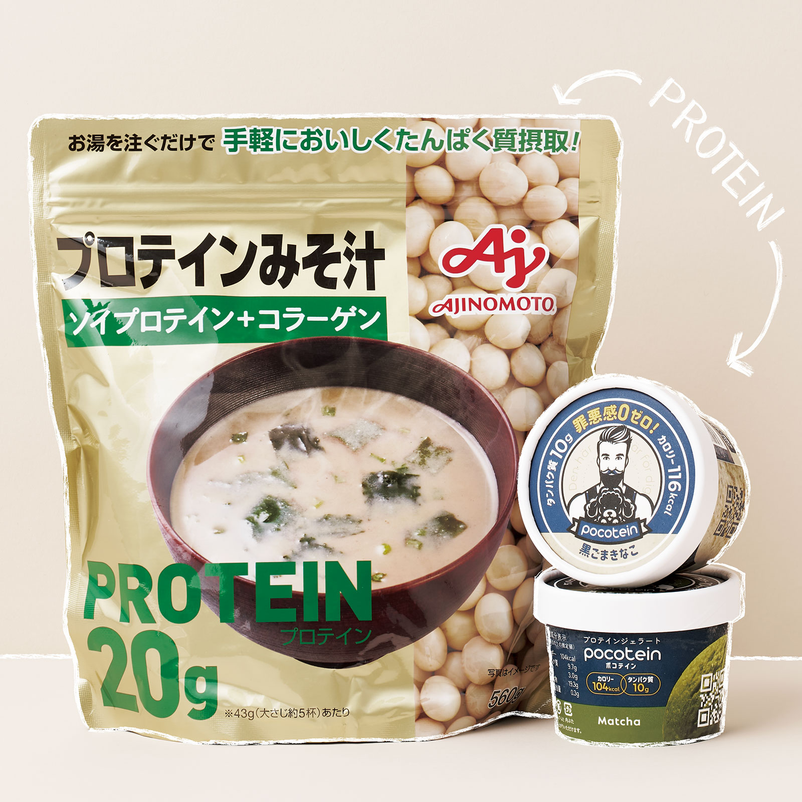 左から:1杯で約20gのタンパク質が摂れる。味の素KK プロテインみそ汁560g ¥2,998(味の素)一般的なアイスクリームと比べてタンパク質を約3倍配合。ポコテイン 黒ごまきなこ、めっちゃ抹茶 120ml 各¥298(KULBAY)