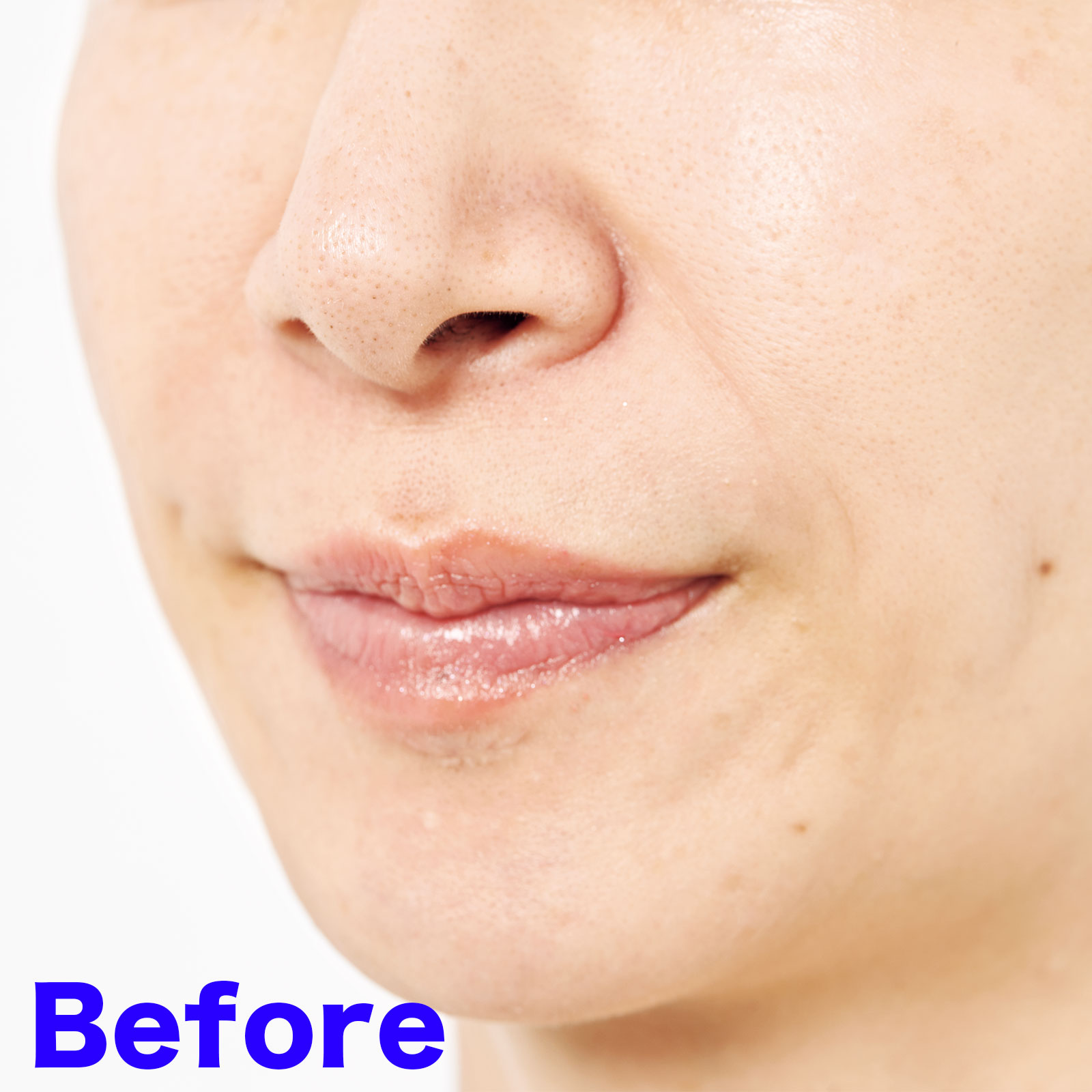 ①ほうれい線の場合は小鼻の横からつけ始め、小鼻と口角の中間までつける