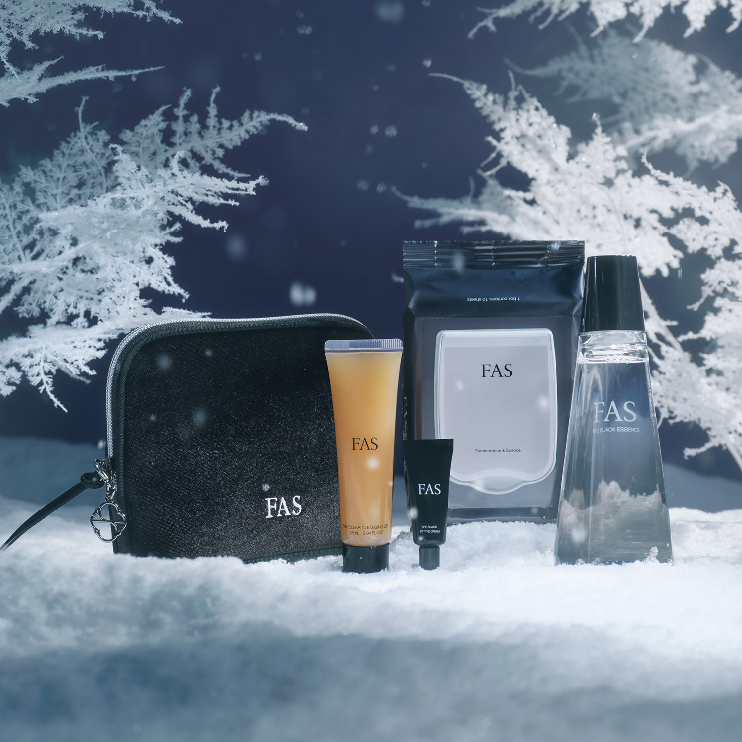 エッセンス・アイクリーム・クレンジングジェルの現品の豪華コフレ。FASのスペシャルケアであるナイトチャージマスクやシートマスクのミニサイズ、クリームのミニサイズもついて、FASのエイジングケアをフルラインで試せます。ホリデー限定のバニティポーチつき。