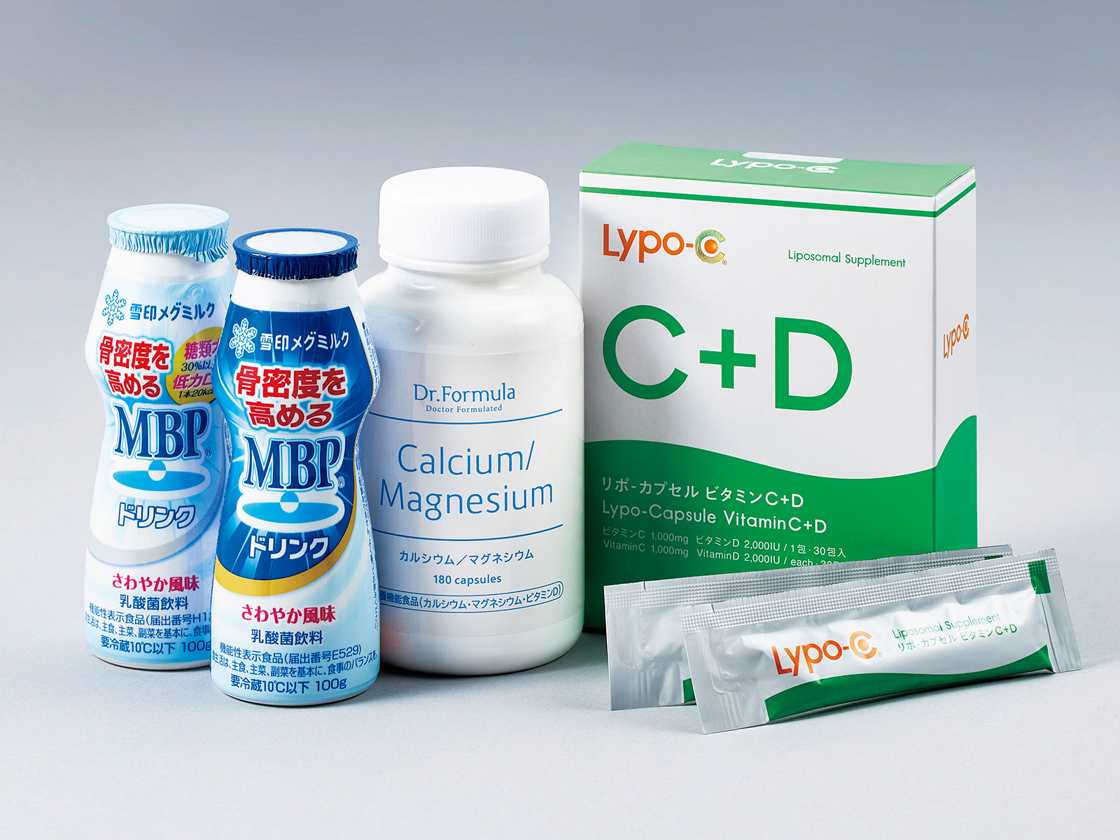 左から:MBPドリンク糖類オフ・低カロリー・MBPドリンク オープン価格/ともに雪印メグミルク カルシウム/マグネシウム30日分¥2,300/アークワイズ リポソーム化し吸収率を追求。リポ・カプセル ビタミン C+D 30包入り ¥8,964/スピック