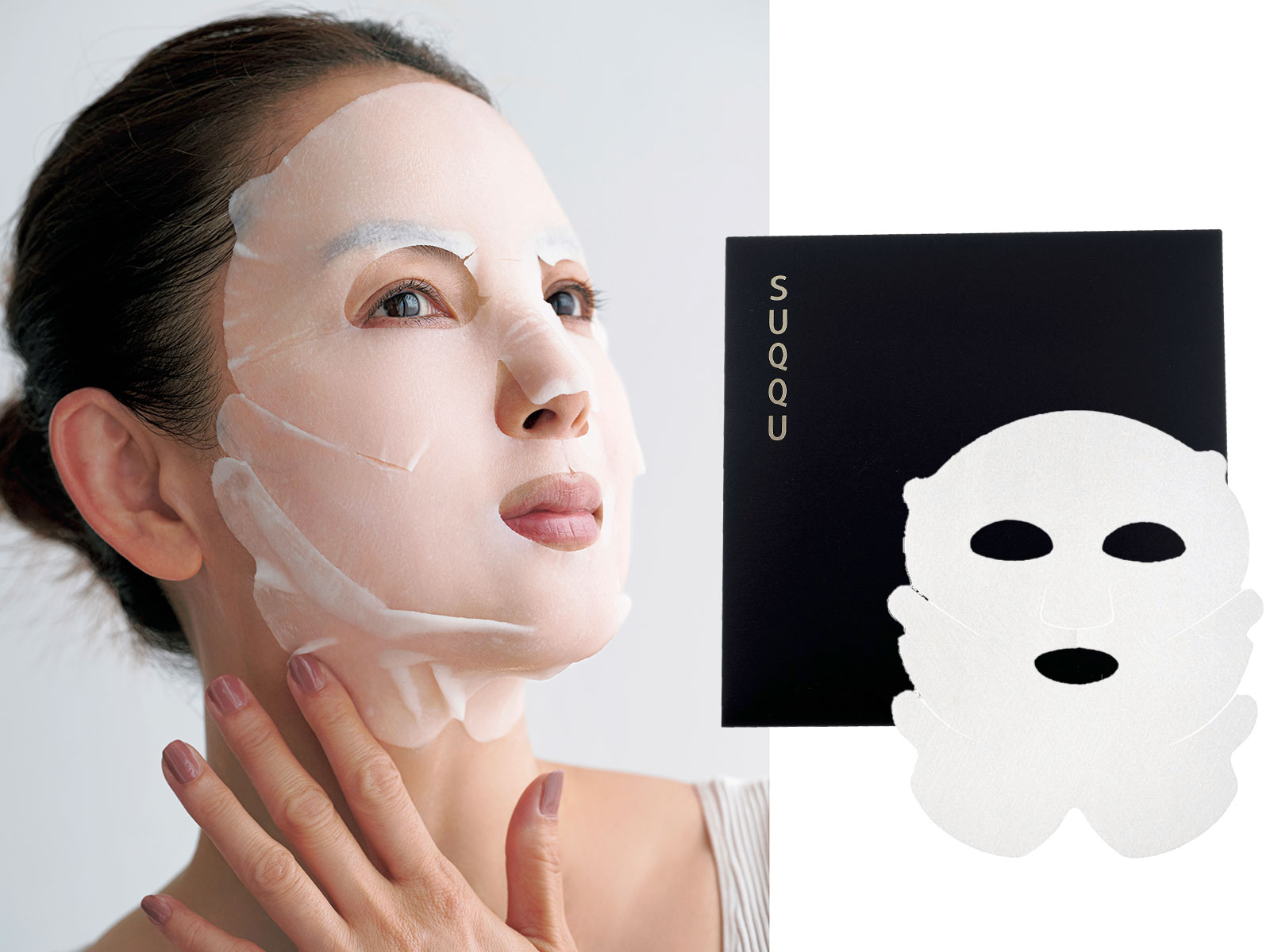 たるみを寄せ付けないスキンケアはあご下までカバーできるシートマスクでの朝パックから。上方向に引っ張り上げてすっきりラインに。コクのある濃密液が肌に密着。首元までハリ肌に導きます。ヴィアルム ザ マスク1枚入り ¥2,970/SUQQU