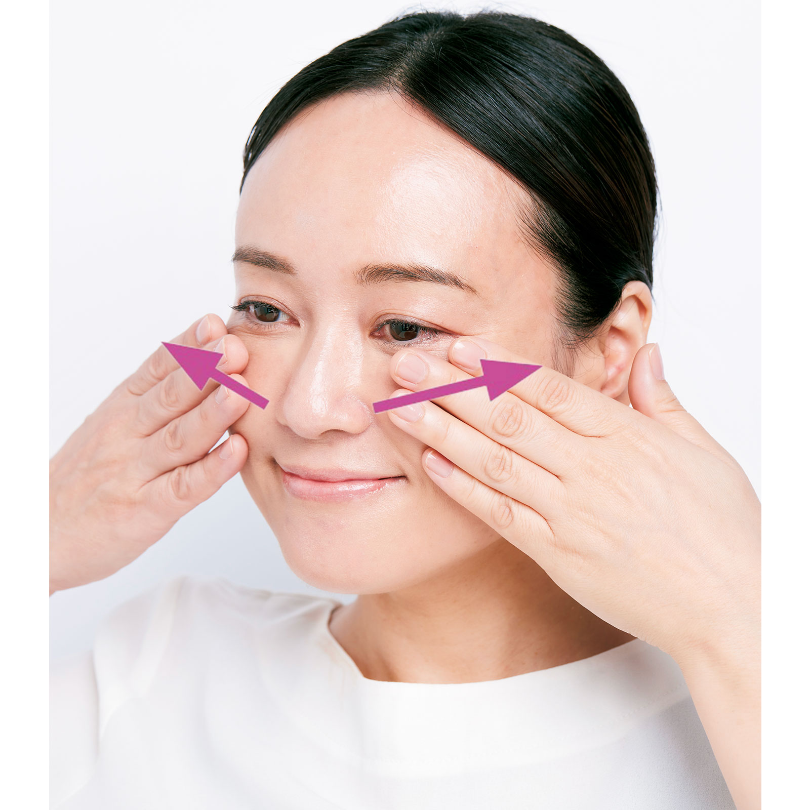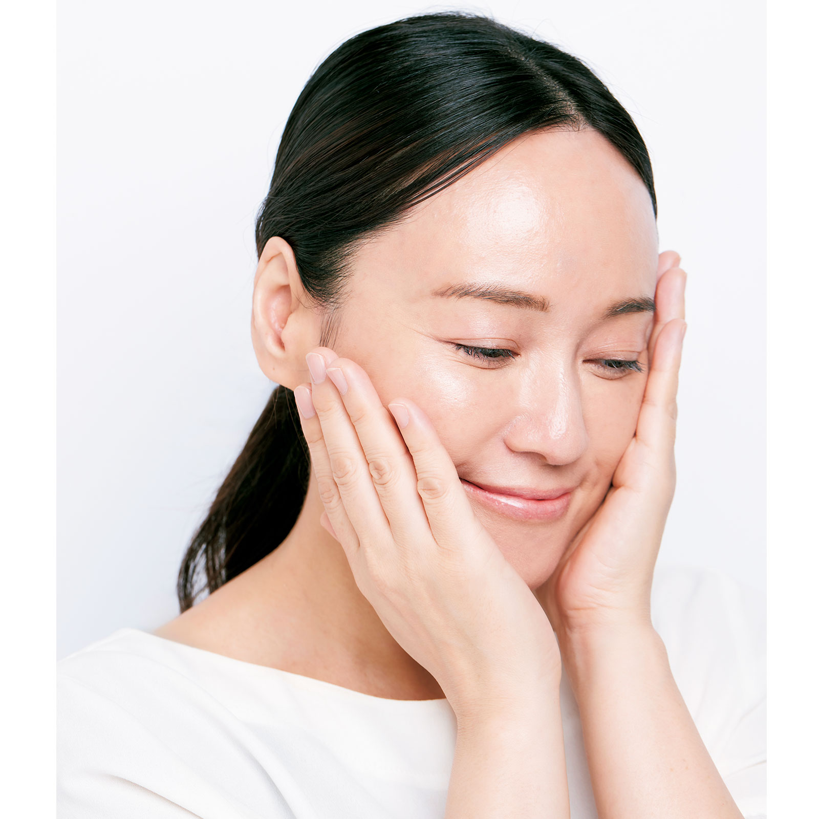 大きめの真珠大を額、頰、あごにのせ、内側から外側に向けて優しくマッサージするように広げながら塗布。最後に手のひらで軽く押さえてなじませます。