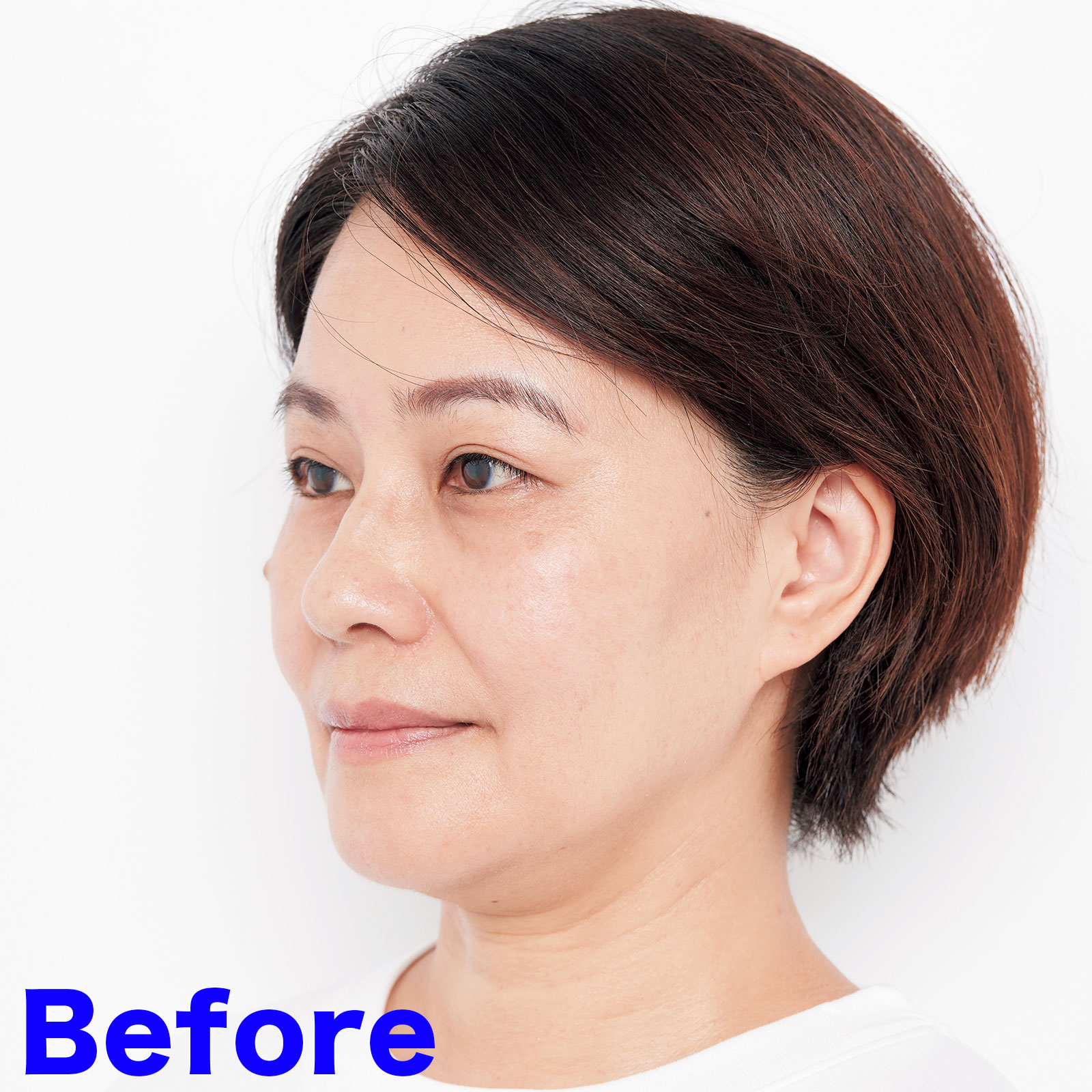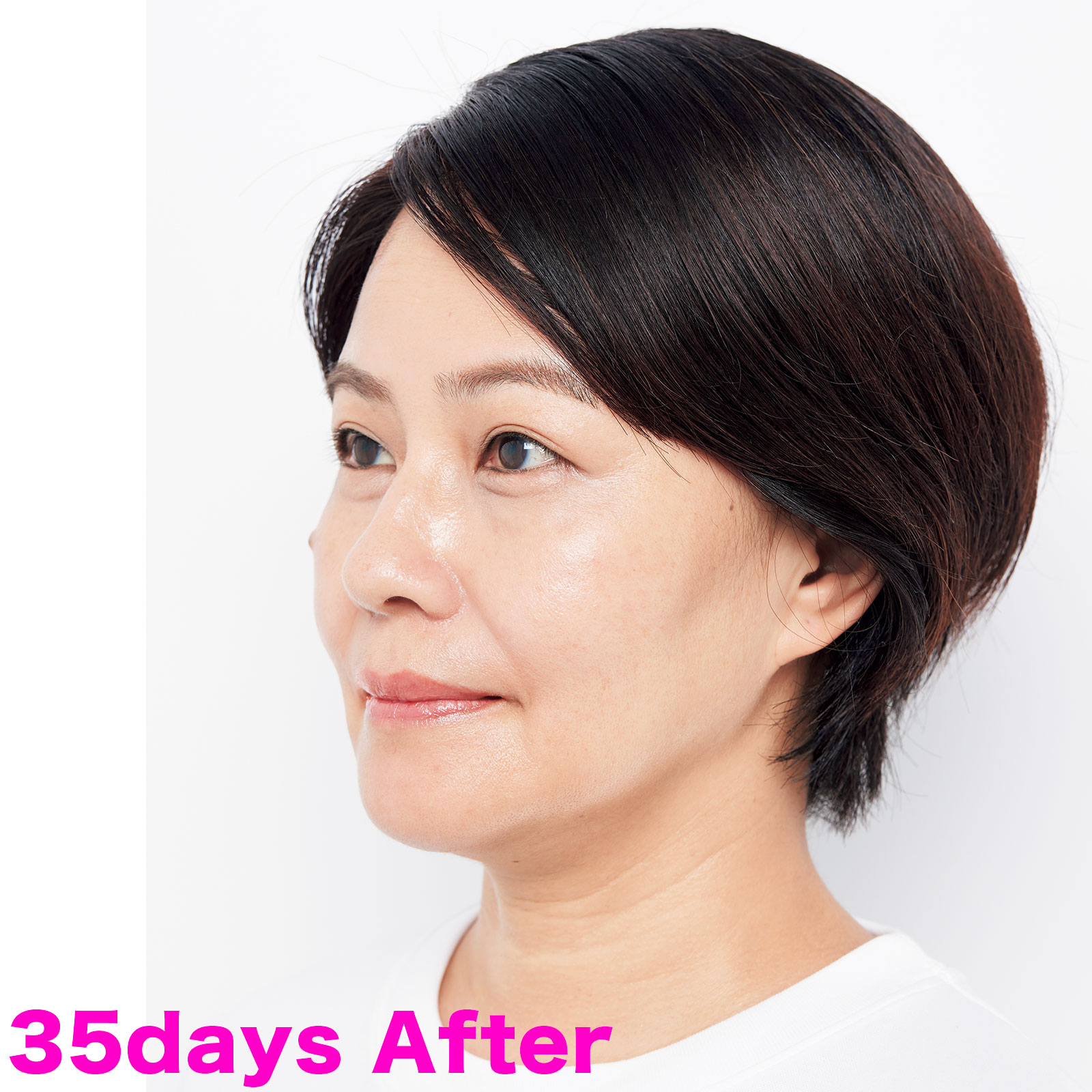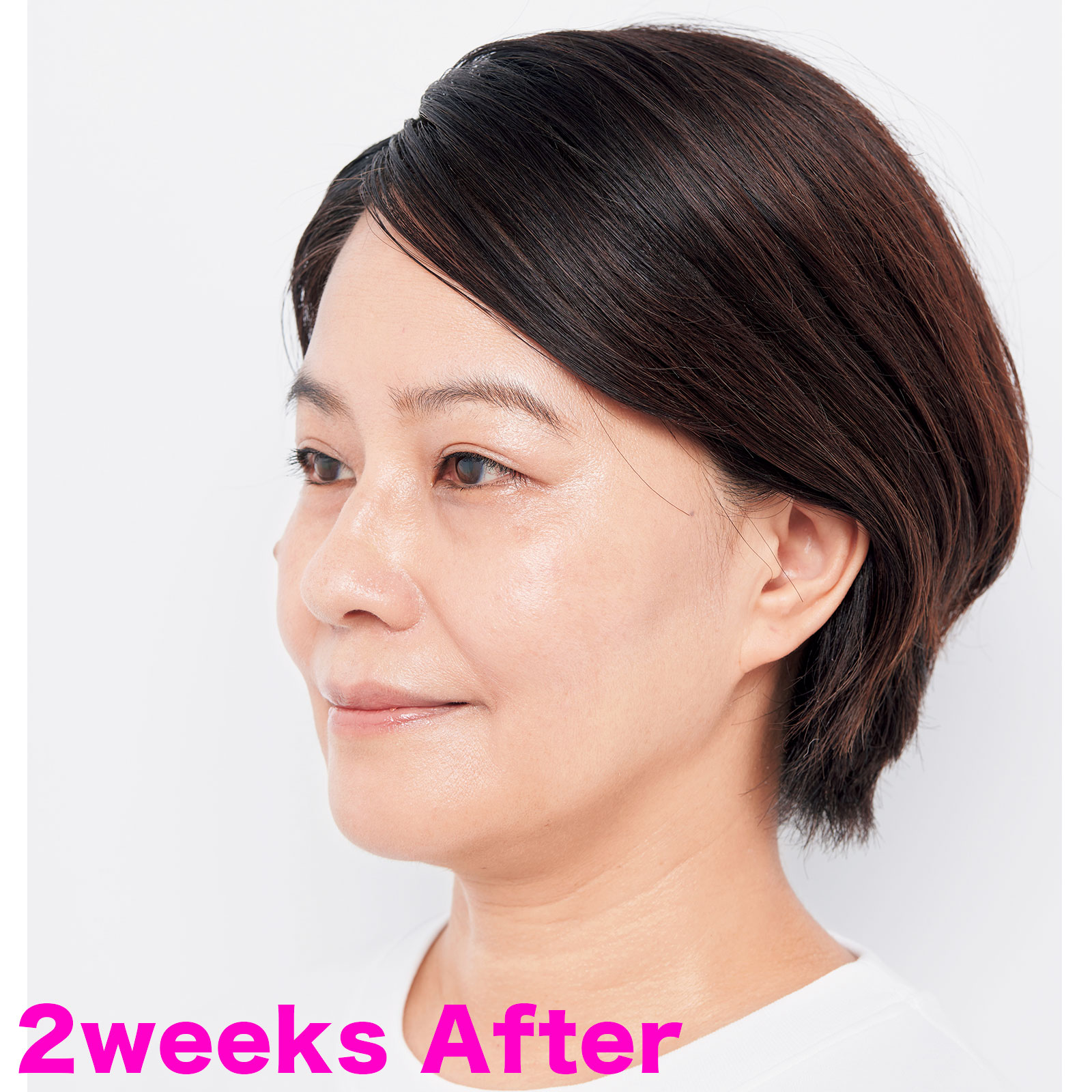 顔の下半分を中心に、もたついていたフェイスラインがぐぐっと鋭角に引き締まった印象。さらに徐々に顔色が明るくなって目周りはふっくら。肌が土台からバージョンアップしたような仕上がりに。