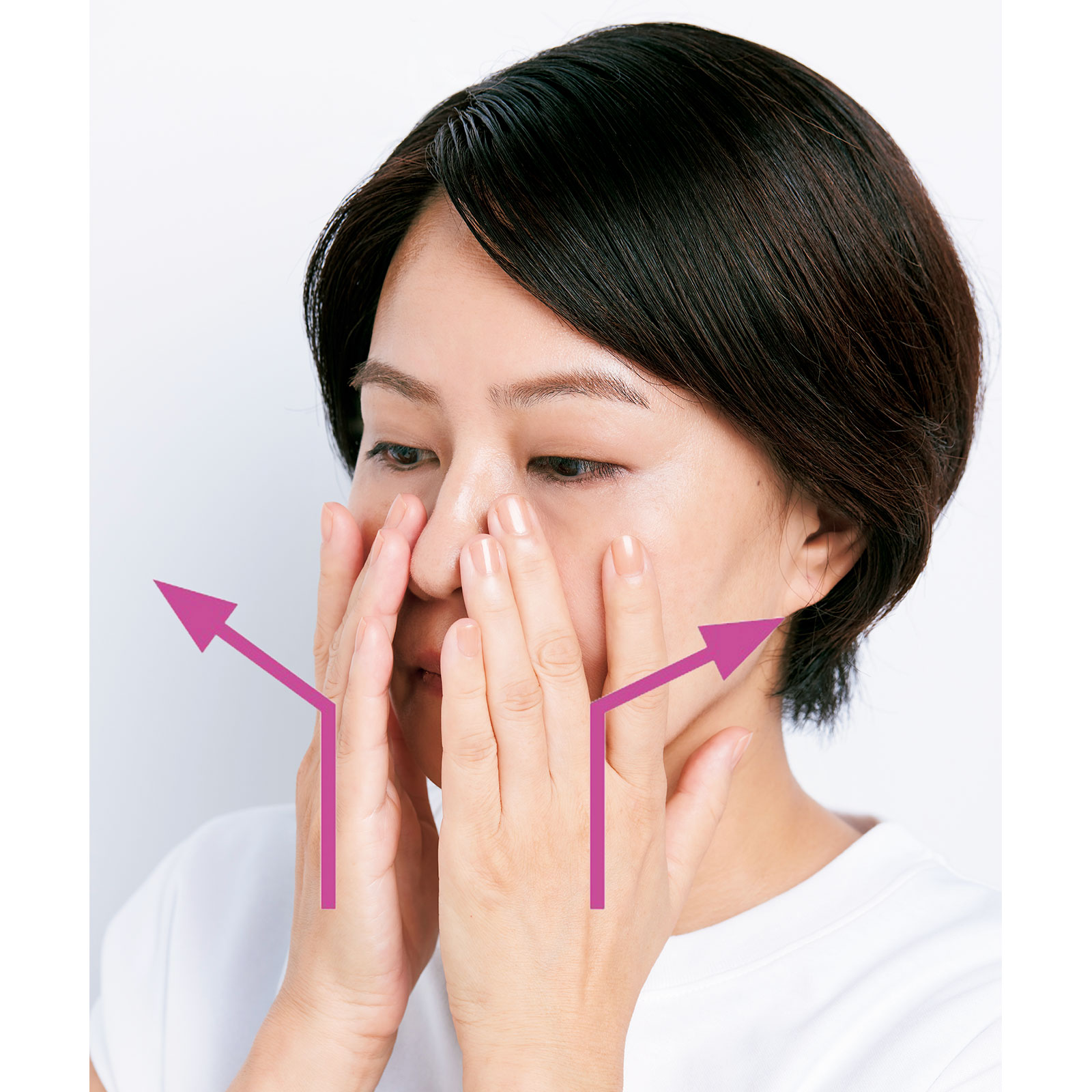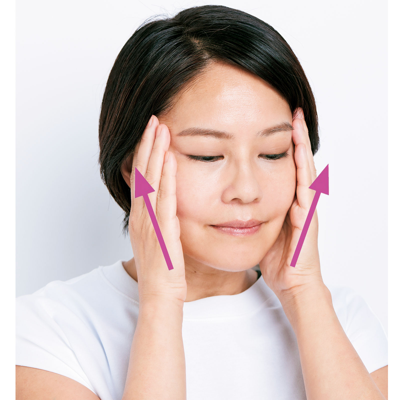 「リフトテンションメソッド」を実践。①あごからフェイスラインを下から上へ引き上げ数秒キープ。②頰から頰骨に沿って引き上げこめかみで数秒キープ。③眉毛下から指の腹を当て額のシワに対して垂直に額の生え際に向かって滑らせて上に引き上げます。