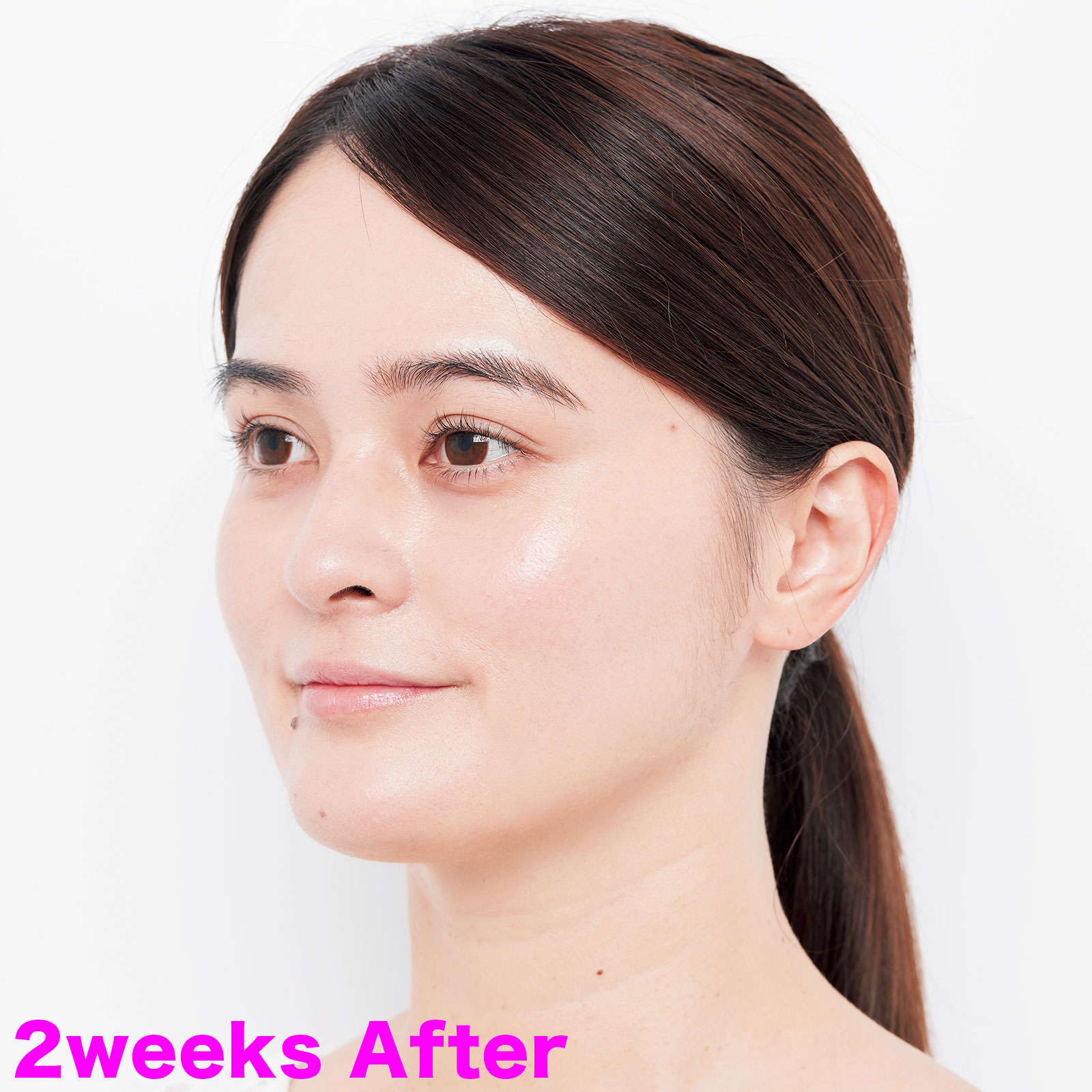 2週間で頰が持ち上がり、ツヤもアップ。35日で目周りのくぼみがふっくら変化し、涙袋にもハリがUP。くすみが晴れてクマも改善しました。ツヤとなめらかさもプラスされて元気な印象に。