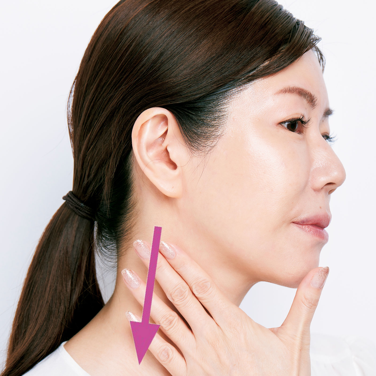 クリームをパール粒大取り、顔の中心から外側へ向けて優しく伸ばします。首は上から下方向へと丁寧になじませていきます。