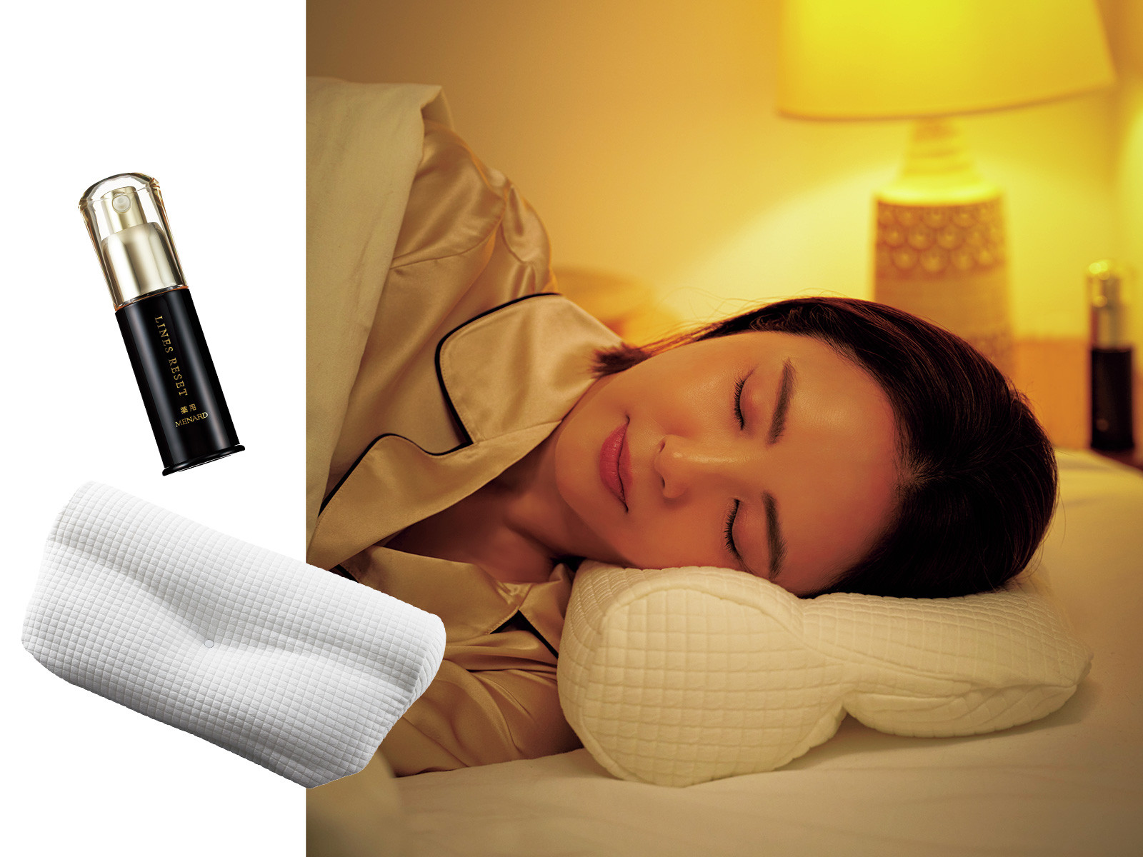 上:薬用ラインズリセット〈20〉 20ml ¥11,000〈医薬部外品〉/メナード 下:Fine Sleep 首ストレッチ枕¥8,778/アメイズプラス パジャマ¥40,000(SLEEPY SLEEPY)