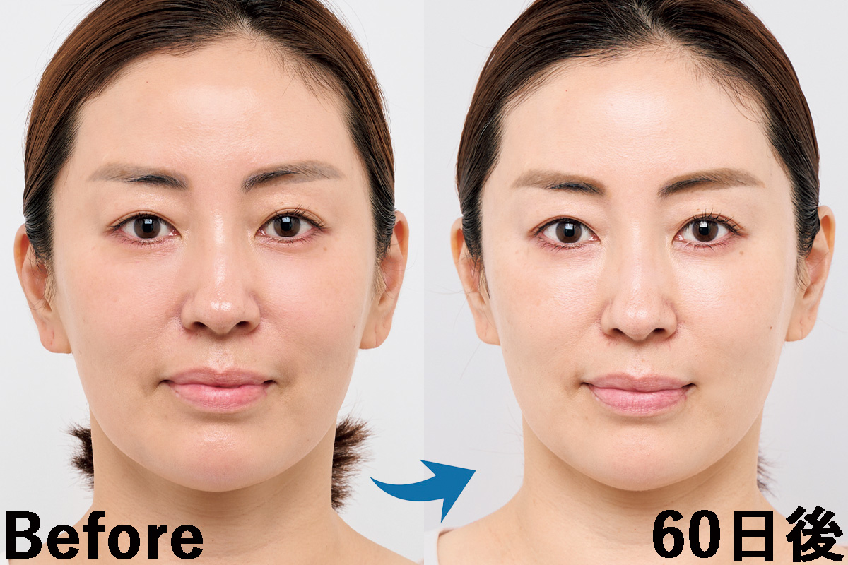 頰のもたつきが減り、顔がスッキリとひと回り小さくなったのが一目瞭然。特にフェイスラインがシャープになりました。肌の赤みも薄くなり透明感アップ。目まわりのたるみも取れて、顔立ちの印象が変わるほど。
