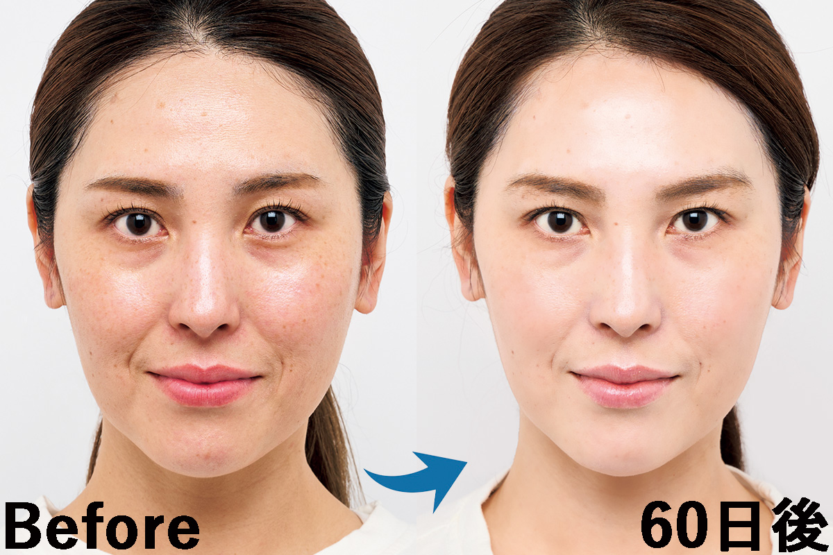 くすんでいた肌が明るくなり、顔全体にツヤも出現。顔色も良くなり血色がよくなったため健康的に!フェイスラインも引き締まり、顎下のゆるみもスッキリとして目元もぱっちり。ハリツヤ肌で小顔印象に。