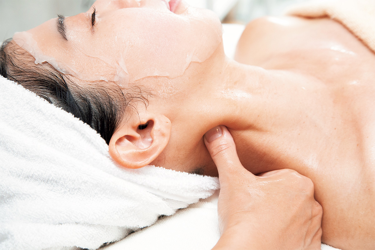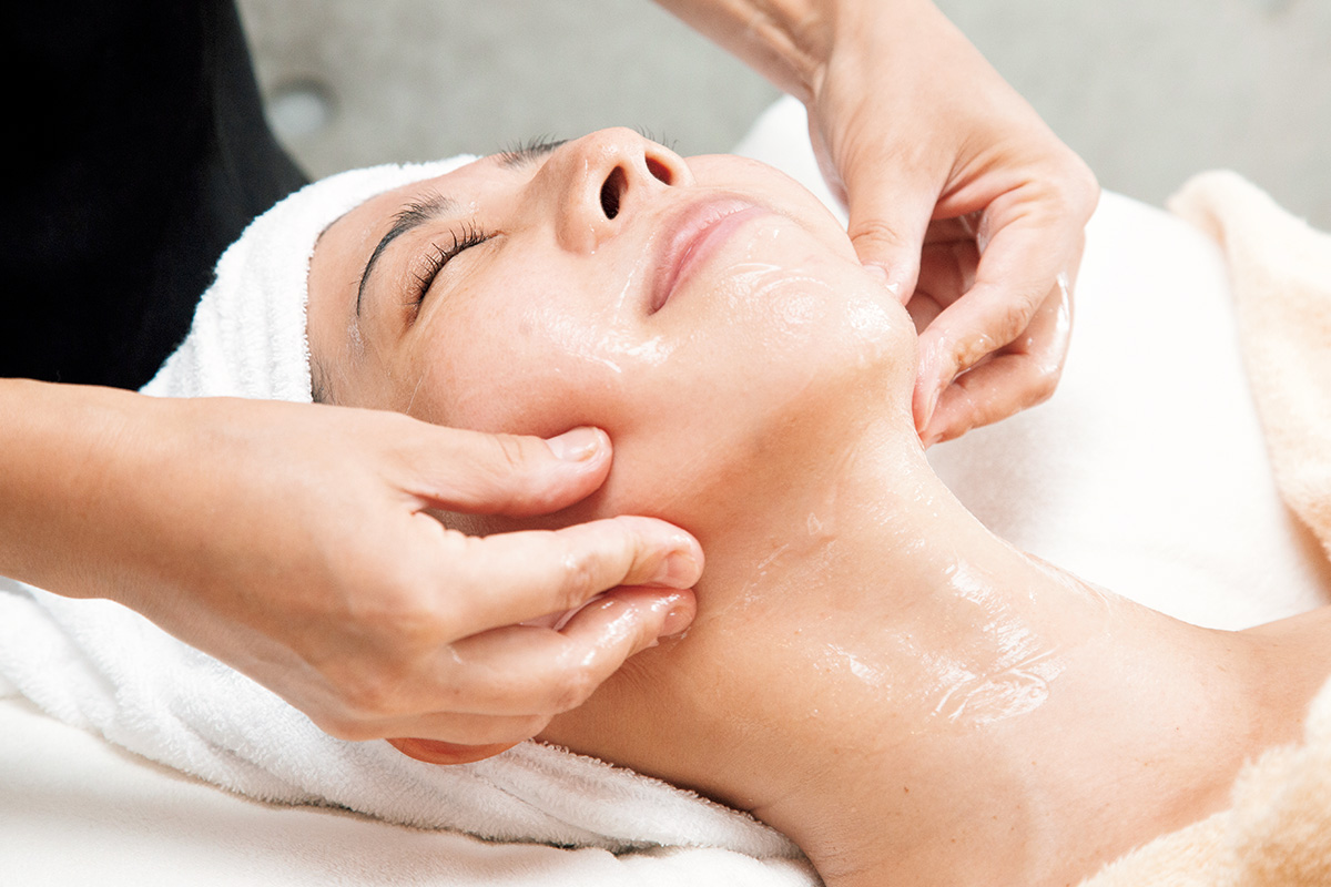 水分量を上げ、弾力のある肌に導いてくれるパックをしながらデコルテとヘッドマッサージ。ここをほぐせばさらなる小顔に。