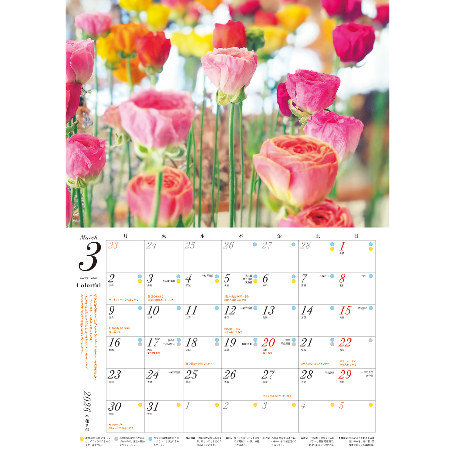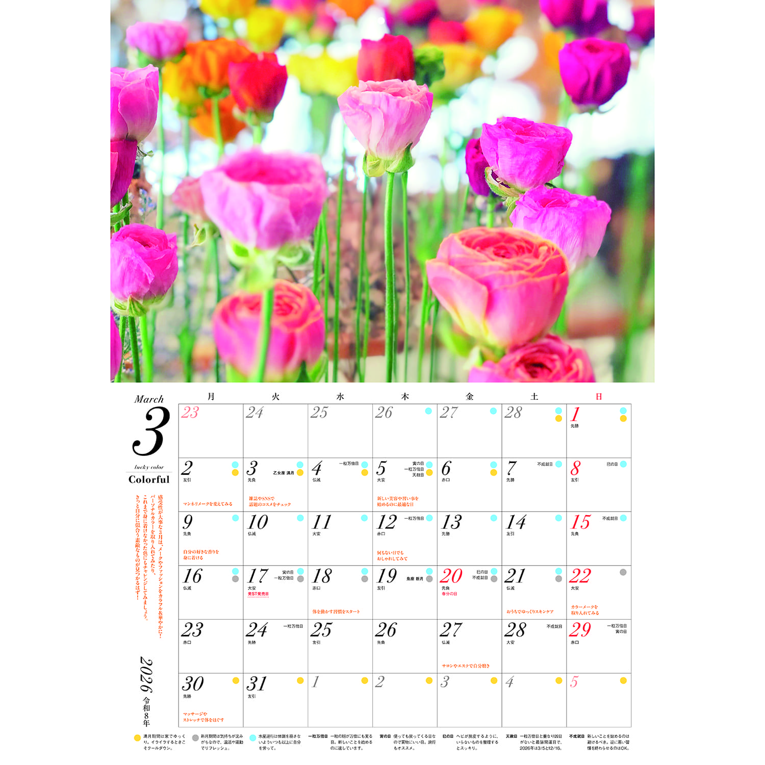 月ごとのラッキーカラーやイメージに合わせたかわいいお花を眺めるだけで運気アップ。写真上部に画鋲のガイドラインがついているので壁に飾っても手帳みたいに使ってもOK。