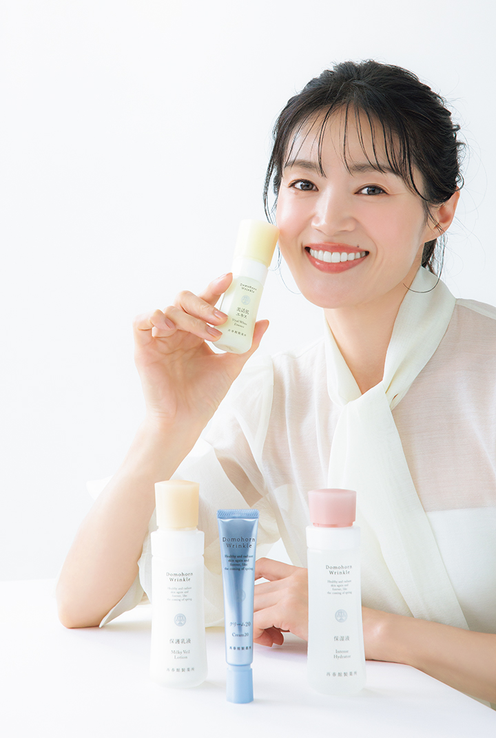 ドモホルンリンクルを初めて手に取ったのは約20年前。〝お手当て〟という独自の手順も知り、その通りに使うとすぐに手応えがあって驚きました。私にとってスキンケアは、忙しい日々の中で瞑想のような時間。【基本4点】は、香りもテクスチャーも、重ねることを想定されたように繊細に作られているから、肌との対話も深まります。ケア後の肌は、まるで乾燥機でふっくら仕上がった布団のような心地よさ。触れると、肌がふわりとするような印象に。この4点には、そんな心地よさを味わえる工夫が詰まっています。