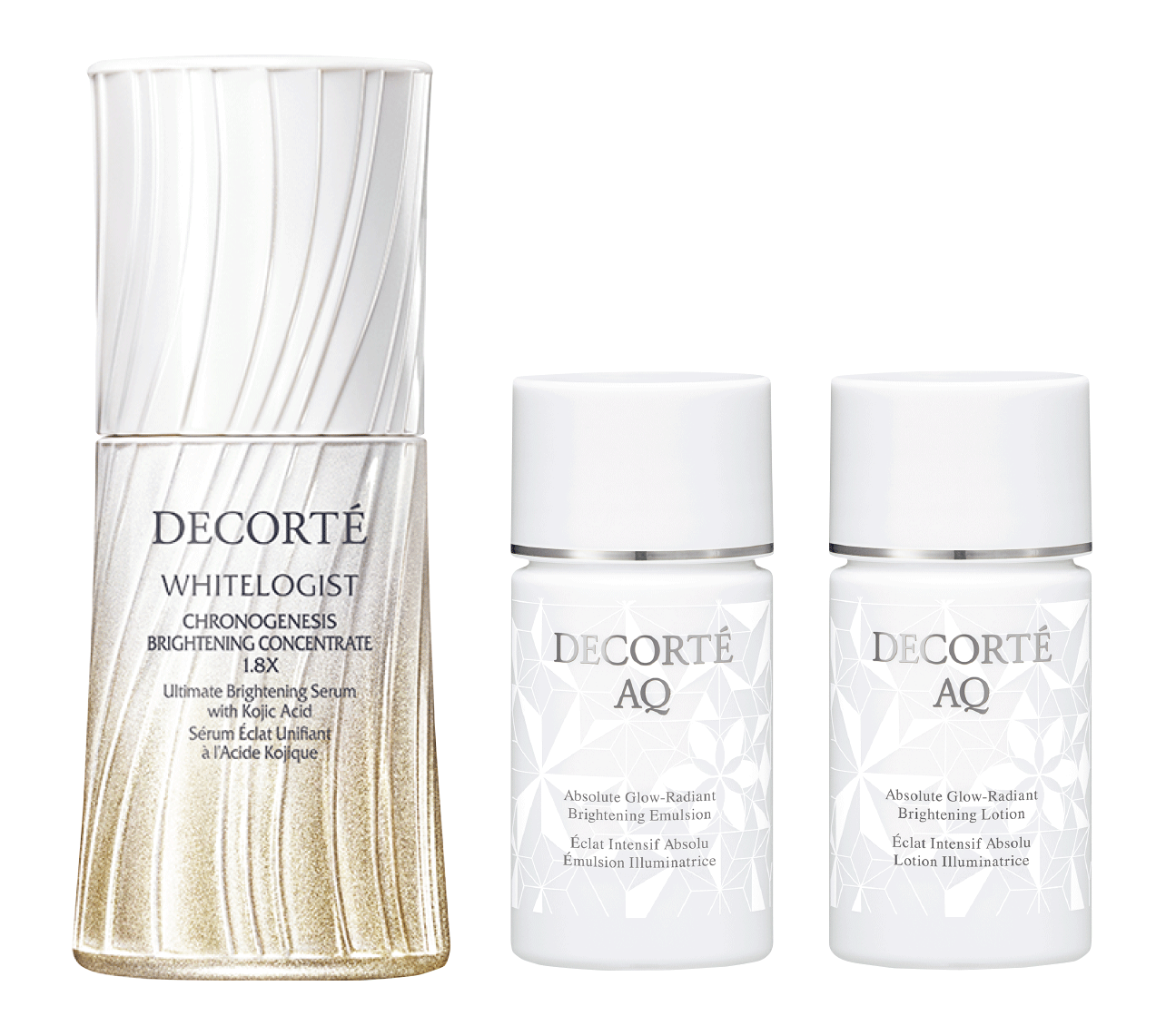 1月16日から数量限定でコスメデコルテ ホワイトロジスト クロノジェネシス ブライトニング コンセントレイト 1.8X[医薬部外品]またはコスメデコルテ ホワイトロジスト クロノジェネシス ブライトニング コンセントレイト[医薬部外品]本品のうちいずれか一品(付け替え用を含む)をご購入につき、コスメデコルテ AQ アブソリュート エマルジョン ブライト[医薬部外品]14㎖、コスメデコルテ AQ アブソリュート ローション ブライト[医薬部外品]14㎖ のサンプルセットを差し上げます。※数量限定につき、売り切れの際はご容赦ください。