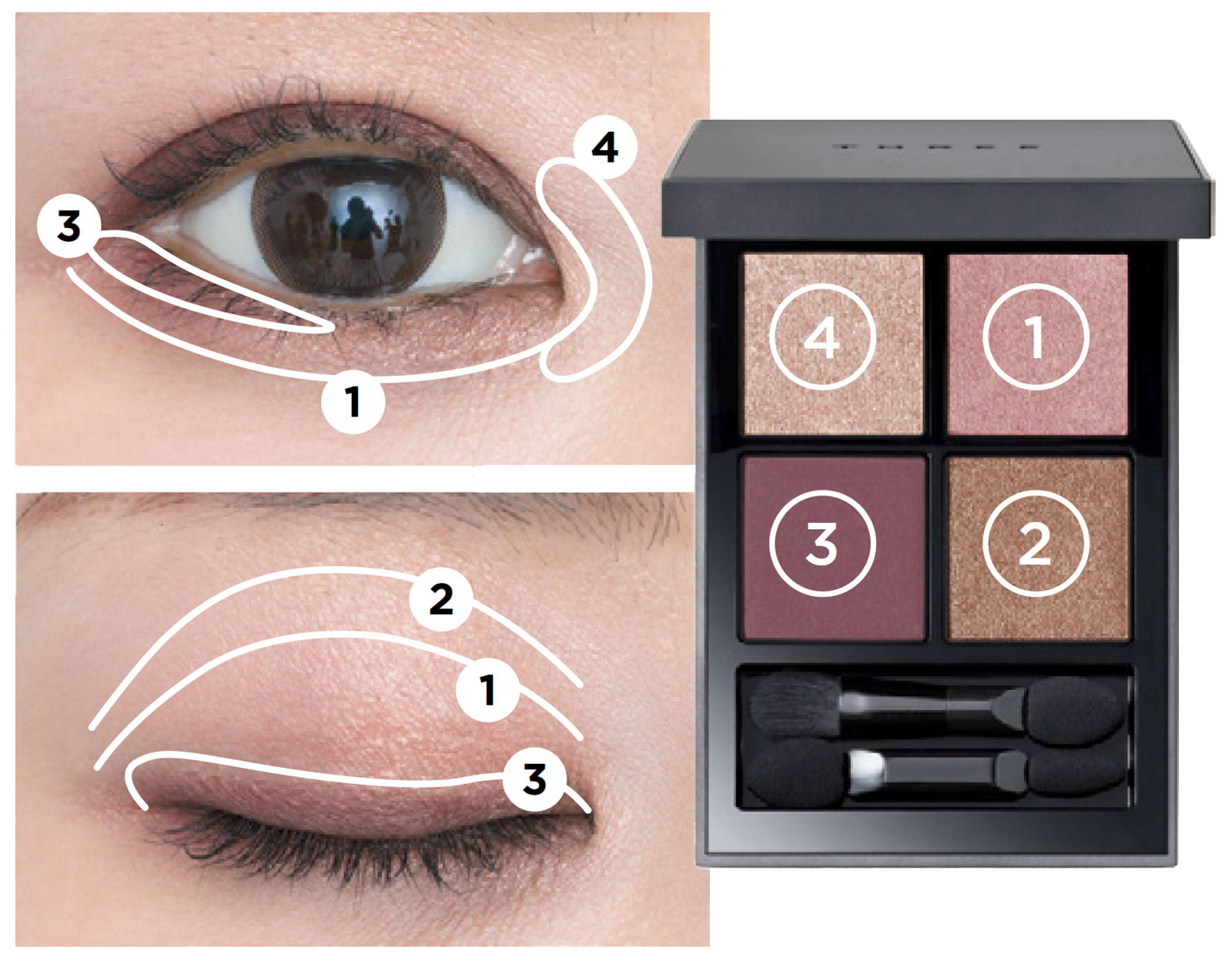 ウォームピンクを軸にしたパレット。立体感を出せる濃淡2色のベージュと締め色のボルドーで吸引力のある目元に。 スターゲージング アイシャドウクアッド 07 ¥7,480(THREE)