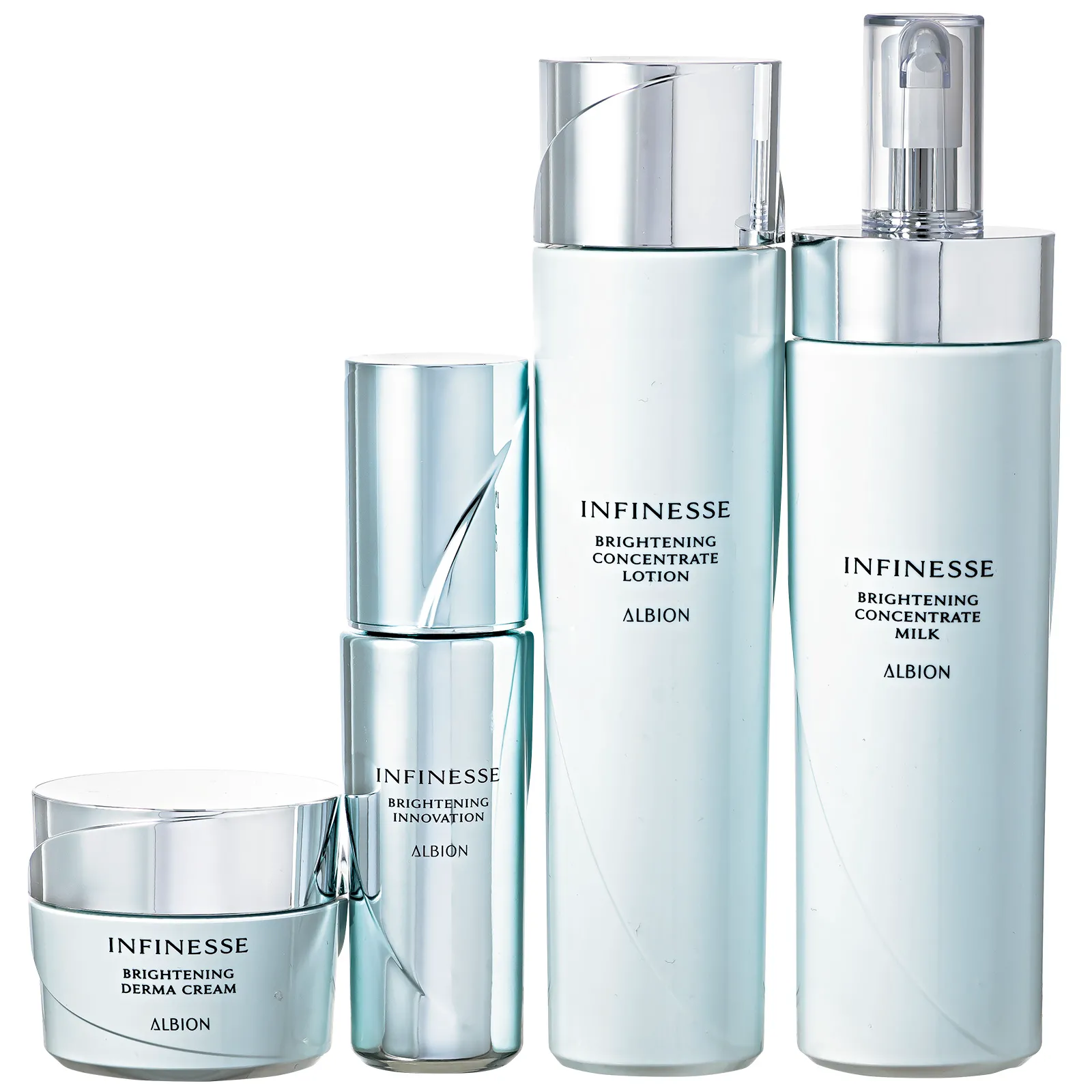 信頼のハリケアシリーズに美白ラインがデビュー。左から、ブライトニング ダーマ クリーム 30g ¥13,200、ブライトニング イノベーション 40ml ¥11,000、ブライトニング コンセントレート ローション 200ml ¥7,700、同 ミルク 200g ¥7,700[すべて医薬部外品](すべてアルビオン)