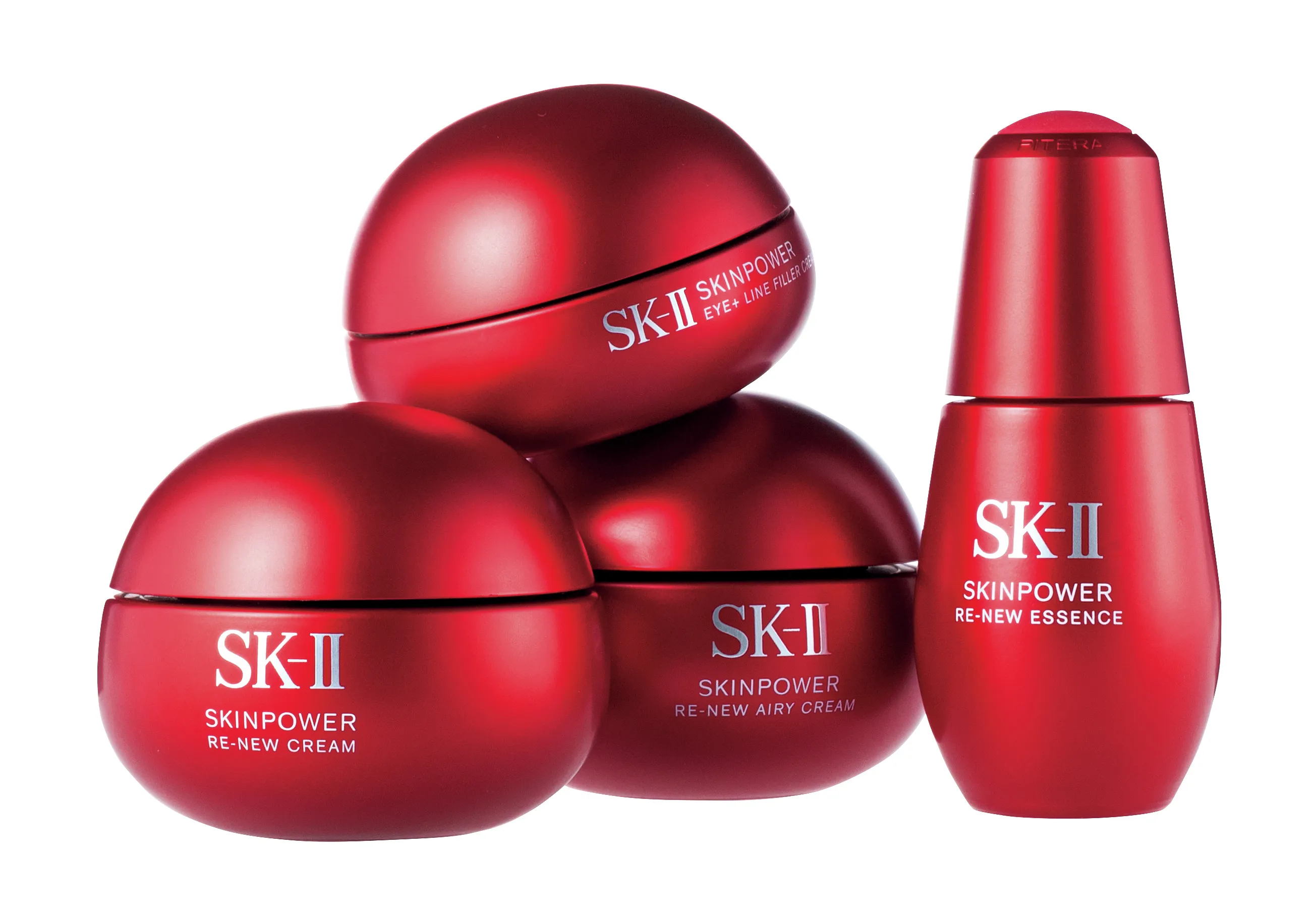 「翌日のハリ感とキメの整い方に感嘆。土台から潤いで満たされ、メーク映えする肌に/ラインでの全顔ケアがパーツごとの緩みを解消。(右から)スキンパワー リニュー エッセンス 30㎖¥18,150、同 リニュー エアリークリーム 50g ¥18,700、同 アイ プラス ライン フィラー クリーム 15g¥15,400、同 リニュー クリーム 50g ¥18,700〈すべて編集部調べ〉(すべてSK-II)