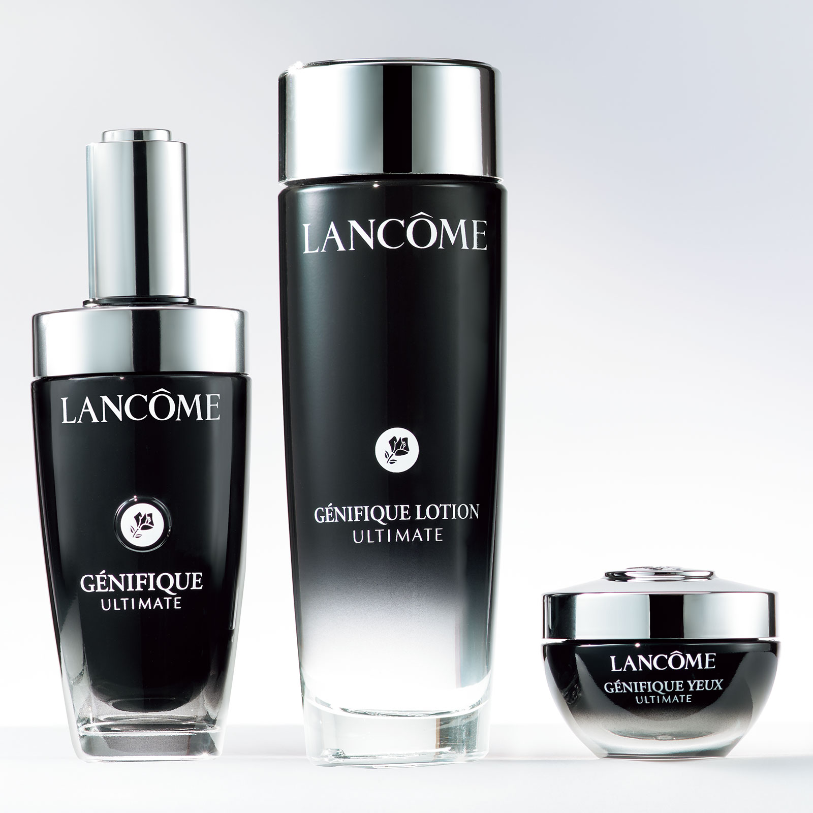 左:回復因子タンパク質を活性化して肌の回復を促進する先行美容液で、ゆらがない肌に。50ml ¥18,700 中:とろみがあるのに伸ばすとすっと浸透してベタつかない化粧水。βグルカンを純度98%で配合。肌に保護膜を張るような設計でみなぎるハリを叶えてくれます。150ml ¥9,900 右:すっきりとした目元に導くグリチルレチン酸を配合。マイクロ化したβグルカンを高濃度にすることで、気になるクマなど、疲労やエイジングサインが出やすい目元をパワフルに整えてくれます。20ml¥11,000(すべてランコム)
