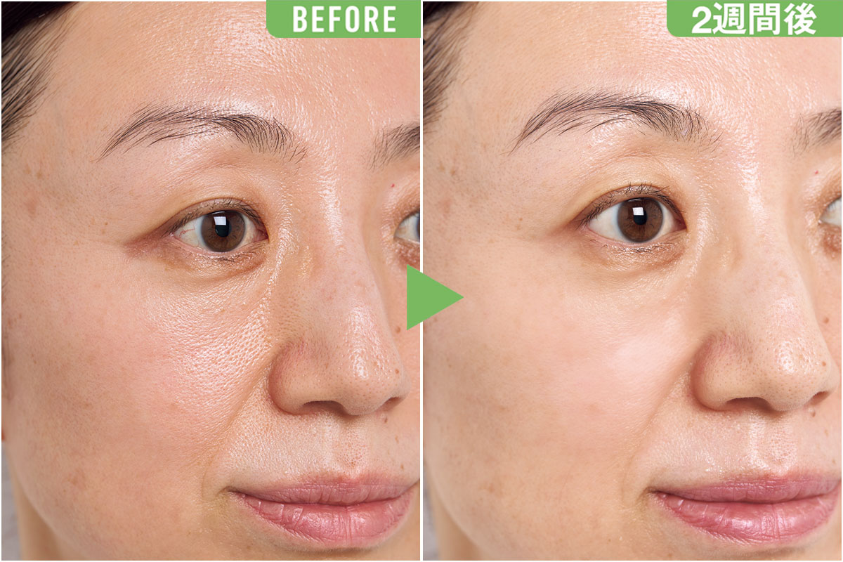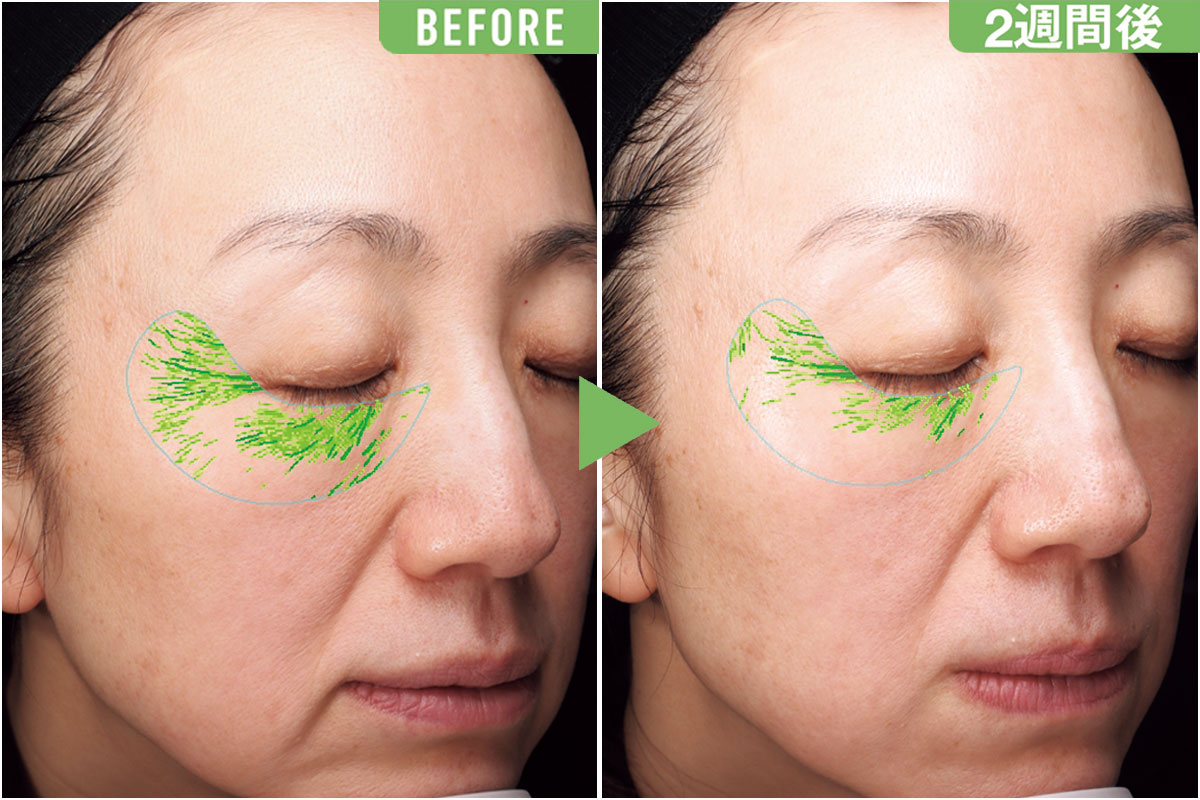 全体的にツヤが出てふっくらとした肌に。目まわりの小ジワとくすみが軽減。VISIAでも目元のシワの深さ、長さが減少。皮膚をふっくらさせるレチノールの効果で乾燥と炎症を抑えることでシワの溝が浅くなったと考えられます。