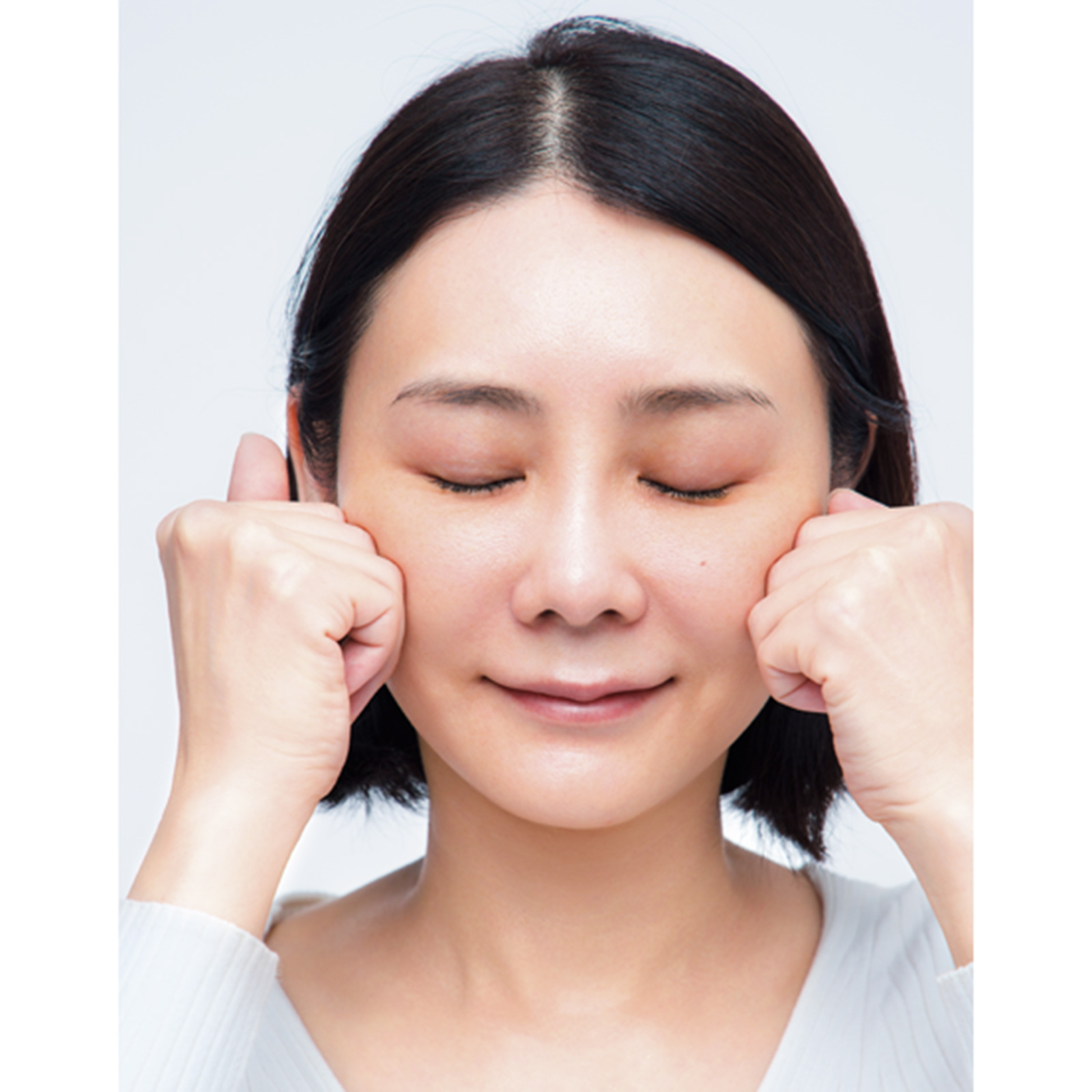 指の第二関節を頰骨の下にあて斜め上に押し上げます。少しずつ手をずらして。