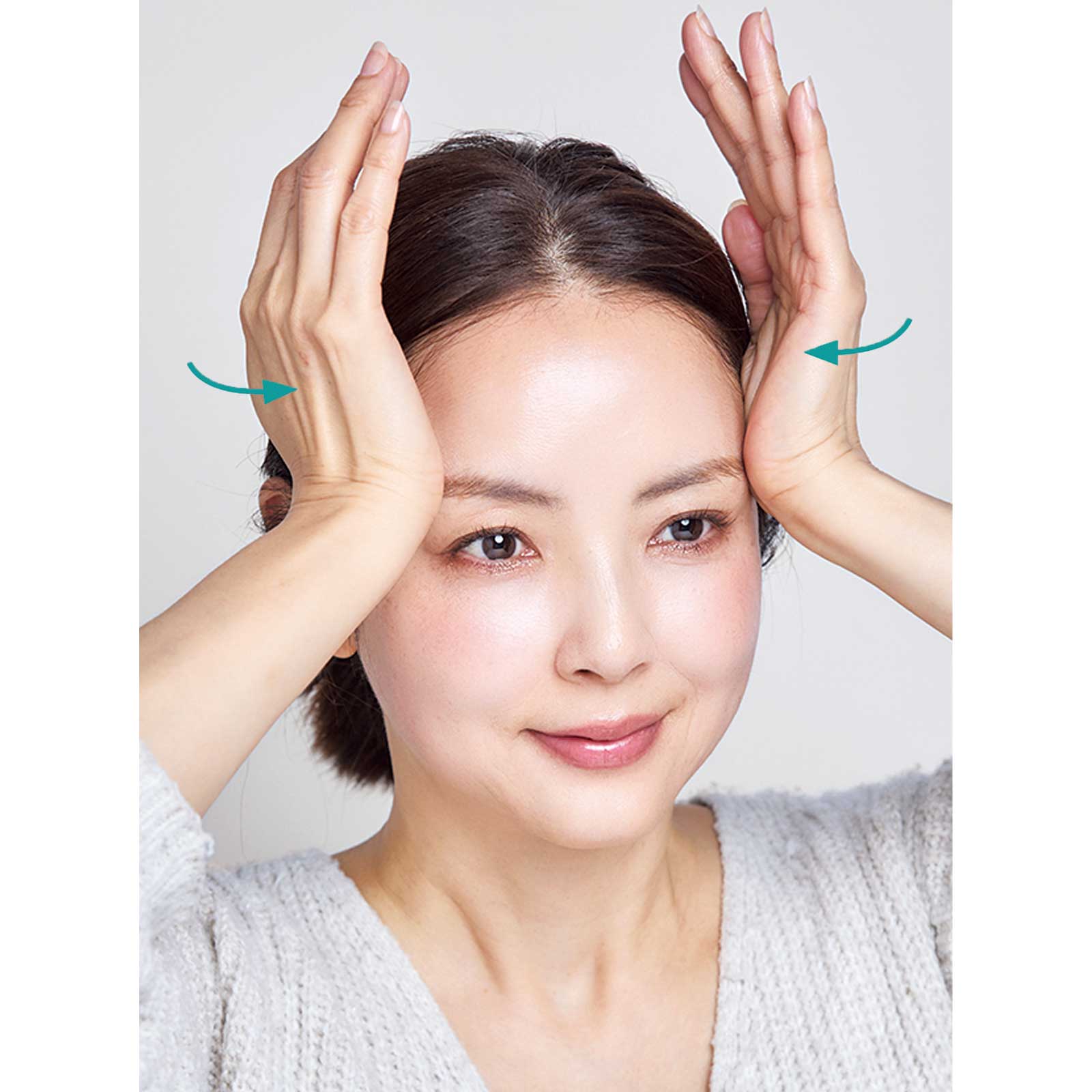 実は頭は血行不良が起こりやすく、老廃物が溜まるのでむくみやすい部分。夜に頭のハチが張るのは主にこれが理由ですが、気圧や寒暖差でも頭部がむくむことも。頭蓋骨が膨らむことで側頭部も膨らみ、頰骨が張り出します。このように顔が横に広がることで顔が大きく見えるので、小顔を目指すなら頭蓋骨に、弱く持続的に圧をかけるのがおすすめです。
