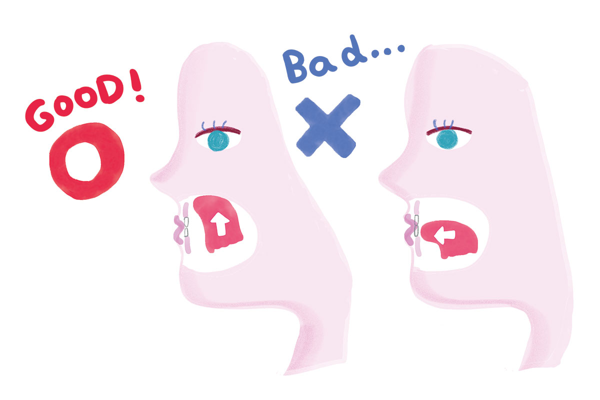 舌は、上顎に付き、伸びやかなのが正解ですが、無理に上の位置につけようとするとかえって筋肉が固まり、下顎が後ろに下がってたるみやすくなることも。舌の位置を意識せずとも正しい位置にするための舌ワイパーを取り入れて訓練をするのがおすすめです。