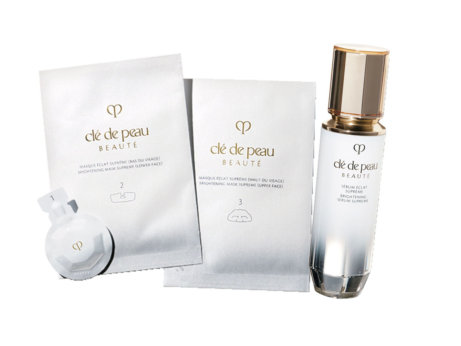 シミの根源にアプローチし、メラニンの生成を抑える。左:ジェル洗顔5g×6包、シートマスク(上下)各19ml×6包 ¥36,300※2月21日発売、右:[医薬部外品] 40ml ¥41,800(クレ・ド・ポー ボーテ)