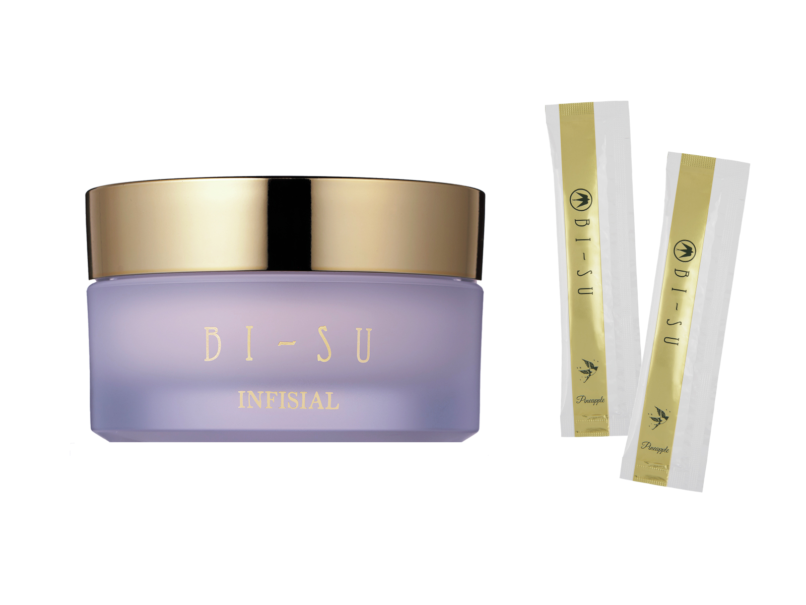右:飲んだ後の内側から湧き上がるようなツヤ感がすごい! 健康を維持するためにも必要だと実感。パイナップル味で飲みやすい。天然アナツバメの巣のエキスを独自技術で凝縮。BI-SU エキスゼリースティック 12g×30本入り ¥16,200(BI-SU)