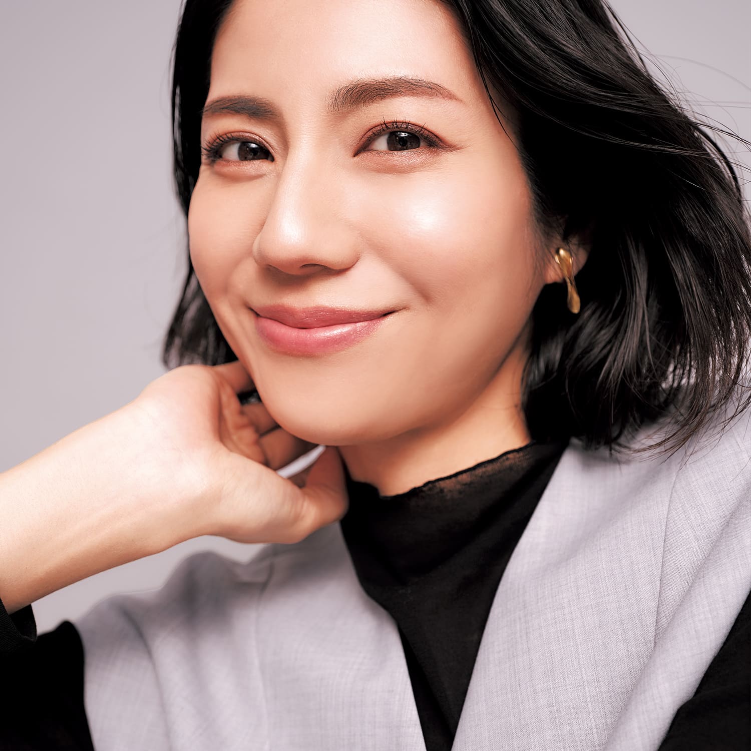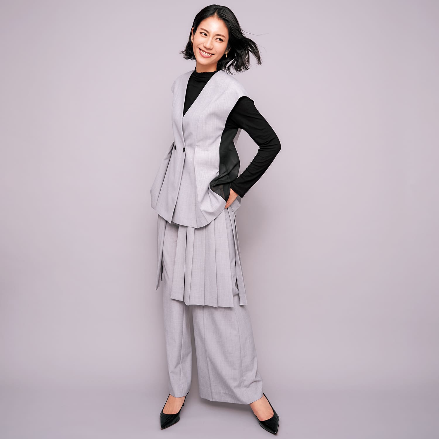 グレーベスト ¥44,000、ブラックシアートップス ¥22,000、パンツ ¥57,200(すべてアドーア)イヤリング ¥26,400(1DKジュエリーワークス/ドレスアンレーヴ)パンプスはスタイリスト私物