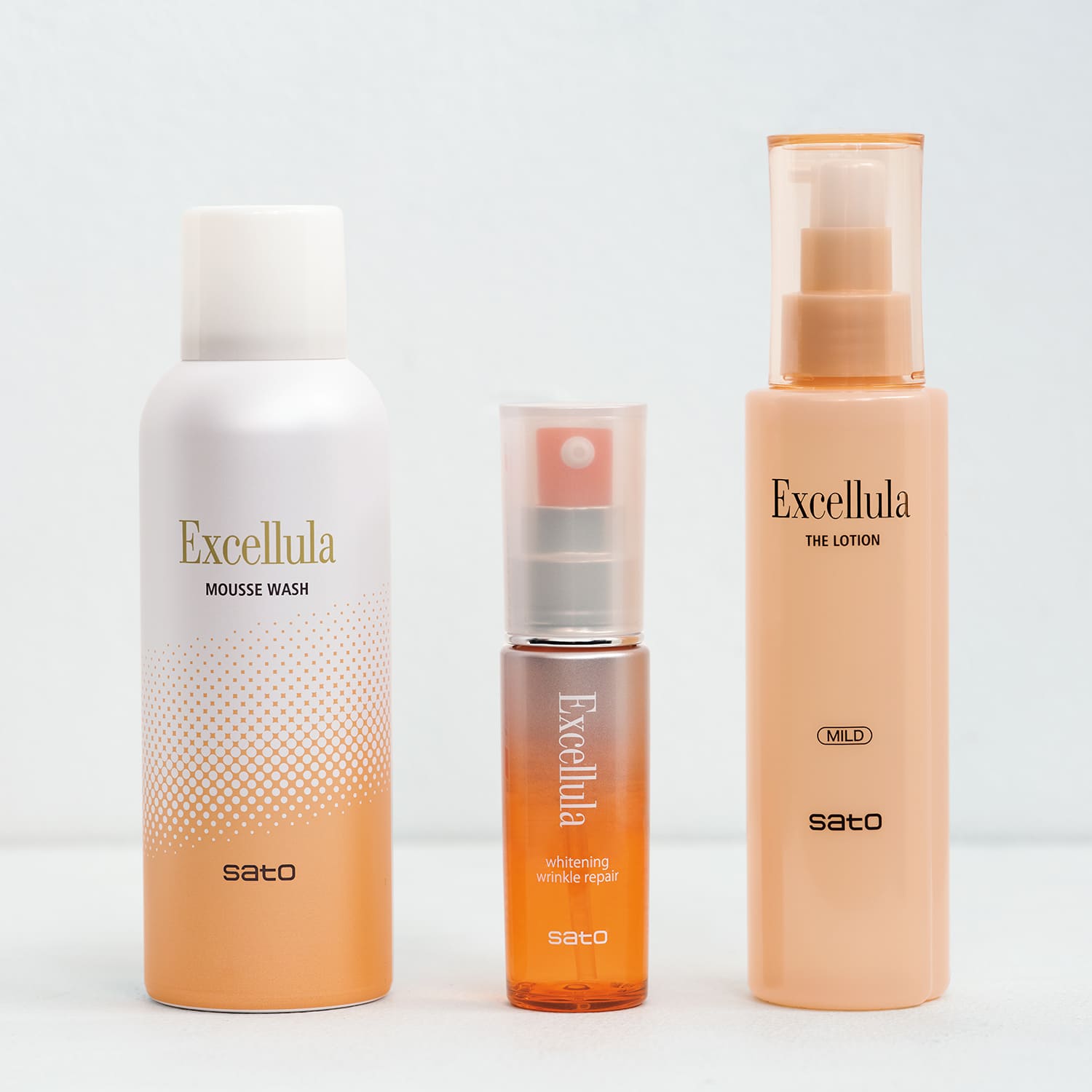 「エクセルーラのムースウォッシュ(左)は泡がきめ細かくて、使っているうちに肌がワントーン明るくなったと感じています。ザ・ローション(右)はとろっとしていて肌に吸いつき、保湿されている実感がすごい! ブースターのホワイトニング リンクルリペア(中)とラインで愛用中です」