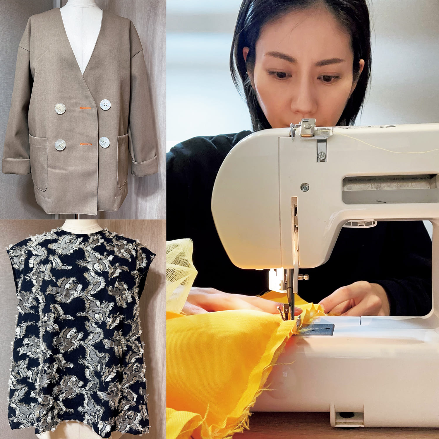 「本格的なミシンを購入し、1日で1着作ることも。ジャケットは今回の取材当日にパンツとのセットアップで着ていったもの。トップスはこの生地にひとめぼれして作りました。次に作りたいのはコート!」