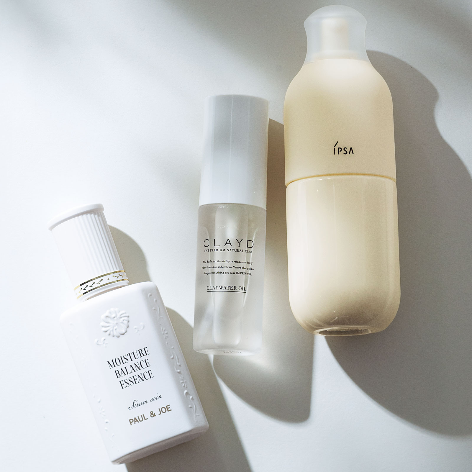 一本でもしっかり潤いを与えるよう考え尽くされたオールインワンに頼って。左から:大人のゆらぎにおすすめのお守り美容液。ポール & ジョー リペア トリートメント 60ml ¥6,600(ポール & ジョー ボーテ)口コミでゆらぎ肌のリピーター続出。CLAYD クレイウォーターオイル 50ml ¥5,610(マザーアース・ソリューション)ブランドの看板化粧液が敏感肌向けに。ME センシティブ n 全4種 175ml ¥7,810 〈セット価格〉 ※2/5発売(イプサ)